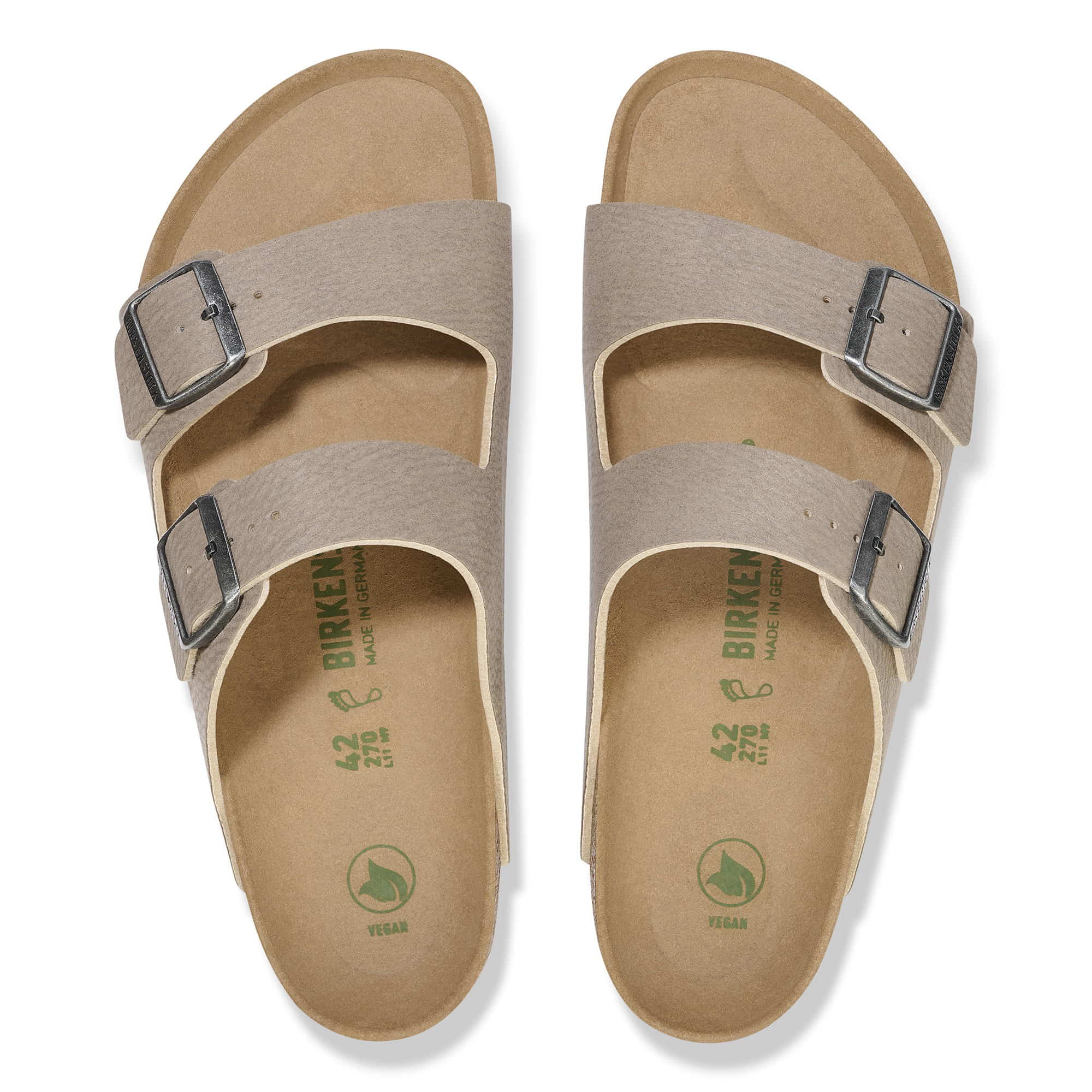 The BIRKENSTOCK Arizona is a genuine classic that has been delighting both men and women with its timeless design for decades. The color-coordinated outsole rounds off the shoe’s look of sophistication. This classic model has been given an update in a new material, with a vegan version now available. It is entirely free of animal products, as verified by independent testing laboratories. The upper is made from a skin-friendly synthetic material. The sandal boasts sophisticated material use with a matte finish that’s reminiscent of natural leather while nevertheless being 100% vegan.