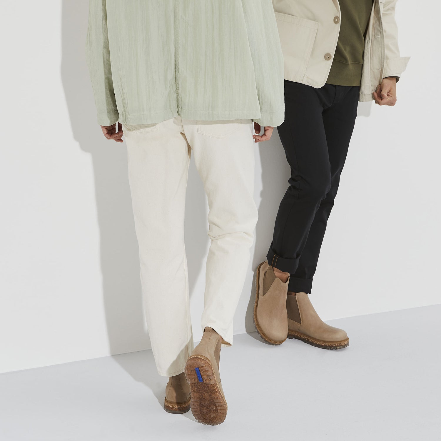 The Stalon is BIRKENSTOCK's robust version of a Chelsea boot. Here, typical Chelsea boot elements like side elastic panels on the understated shaft and a loop at the back have been combined with a solid-looking yet surprisingly light sole made from synthetic materials and moisture-wicking microfiber lining. The cork frame of the outer sole makes for an authentic design. The upper is made from hydrophobic, oiled nubuck leather.