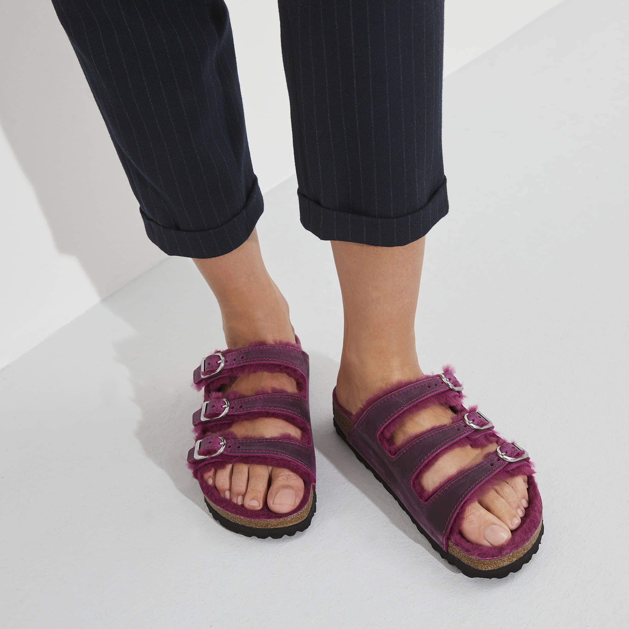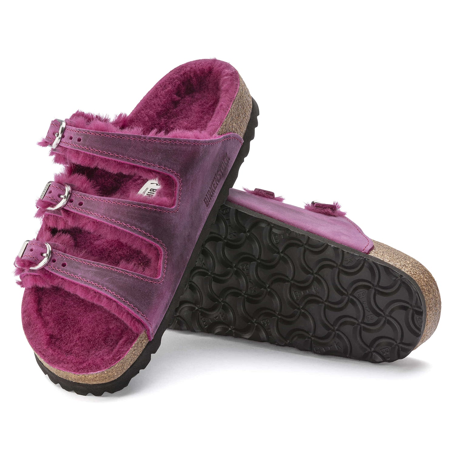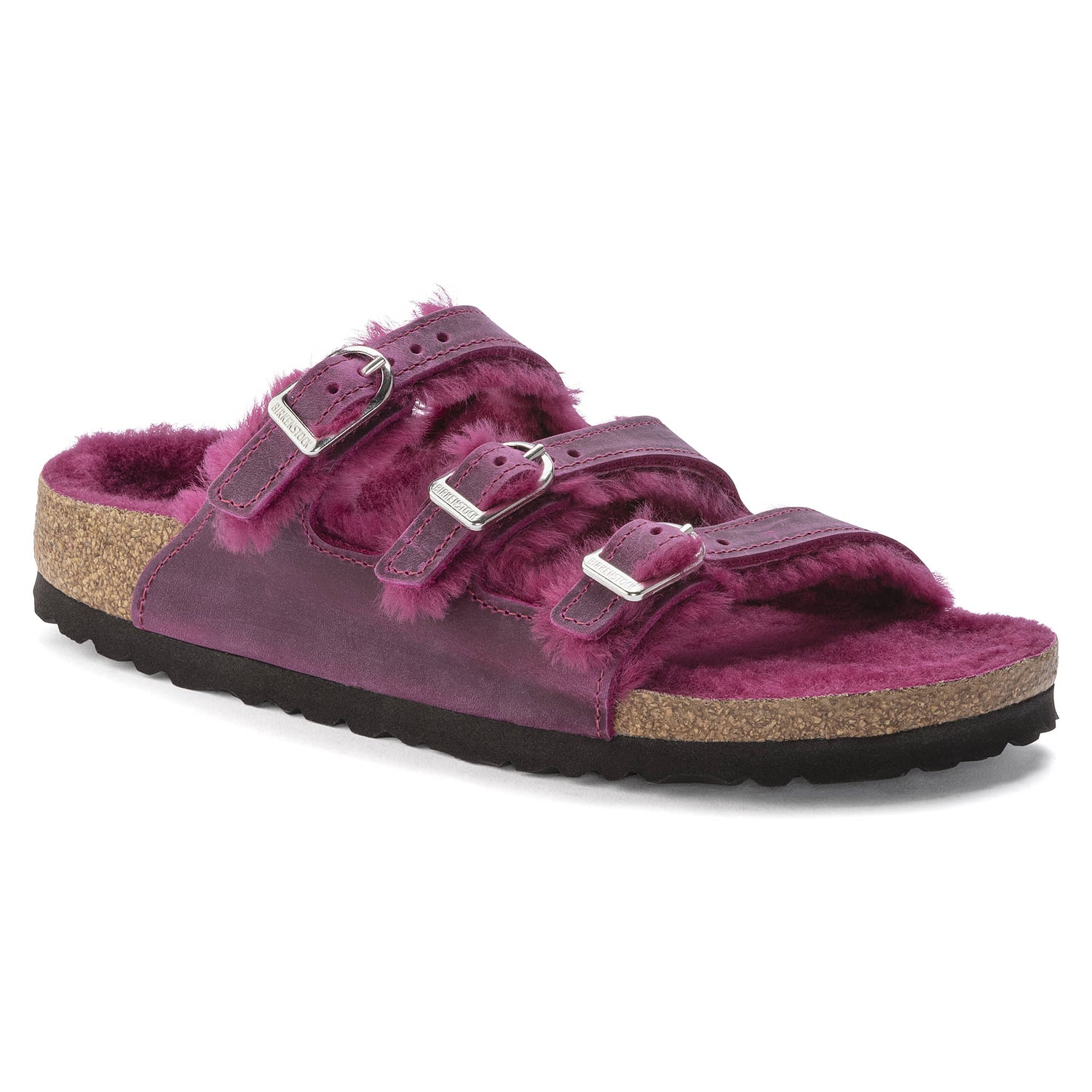 See an active day out in comfort! The BIRKENSTOCK Florida offers good grip and maximum comfort. This version is lined with especially cozy shearling. The buckles in the form of horseshoes are a real eye-catcher. The color-coordinated footbed rounds off the shoe's look of sophistication. The upper is made from extra thick, oiled nubuck leather with an open-selvage finish.