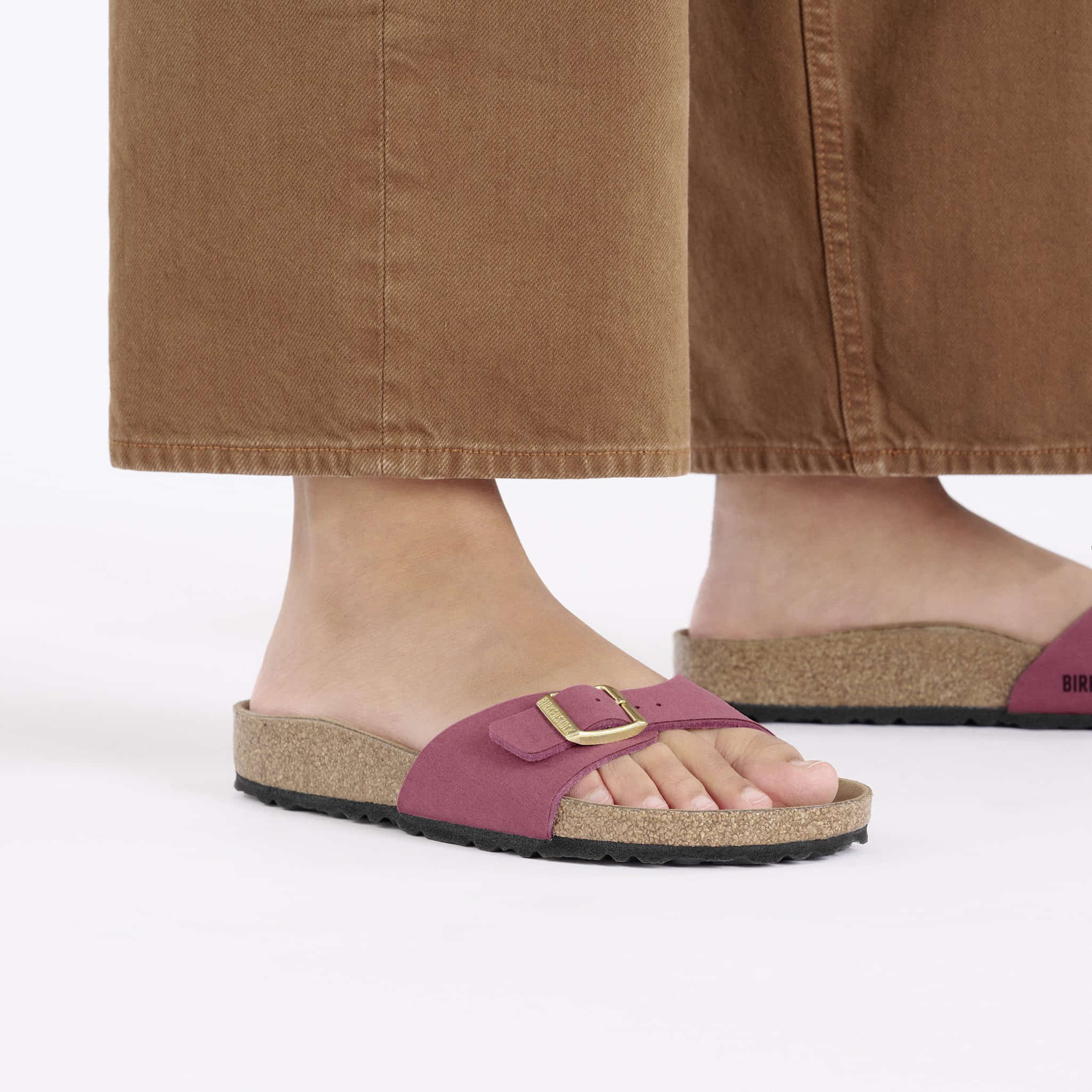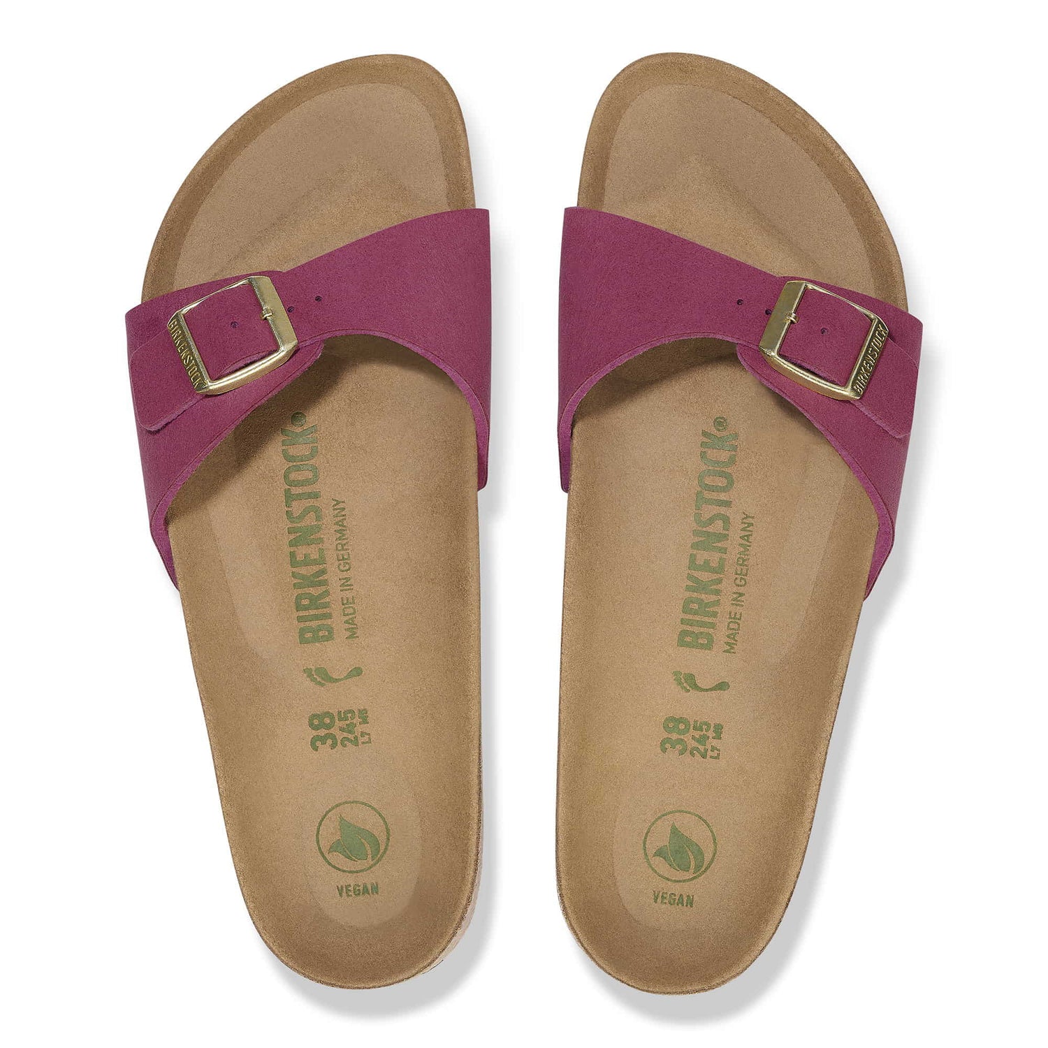 The BIRKENSTOCK Madrid is a genuine classic that delights the world of fashion with its minimalist design. This popular sandal has been given an update in a new material, with a vegan version now available. It is entirely free of animal products, as verified by independent testing laboratories. The upper is made from a skin-friendly, synthetic material with a velvety feel.
