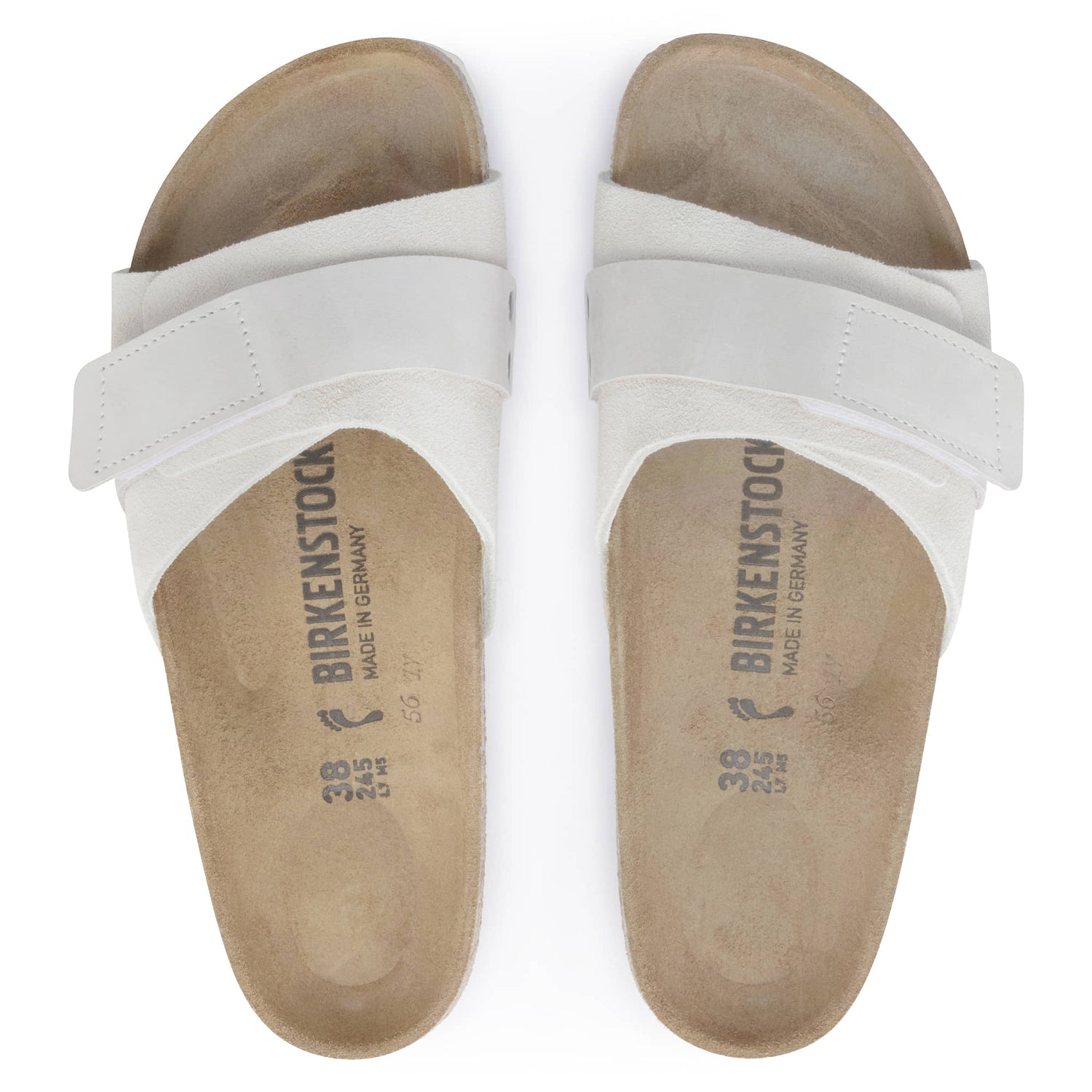 The casual BIRKENSTOCK Oita takes its inspiration from the classic Kyoto model and stands out with its slim and feminine design and individually adjustable fastener. This offers optimum grip and is complemented by two decorative rivets. The upper is made from especially soft suede, which hugs the foot like a second skin, combined with high-quality nubuck leather.
