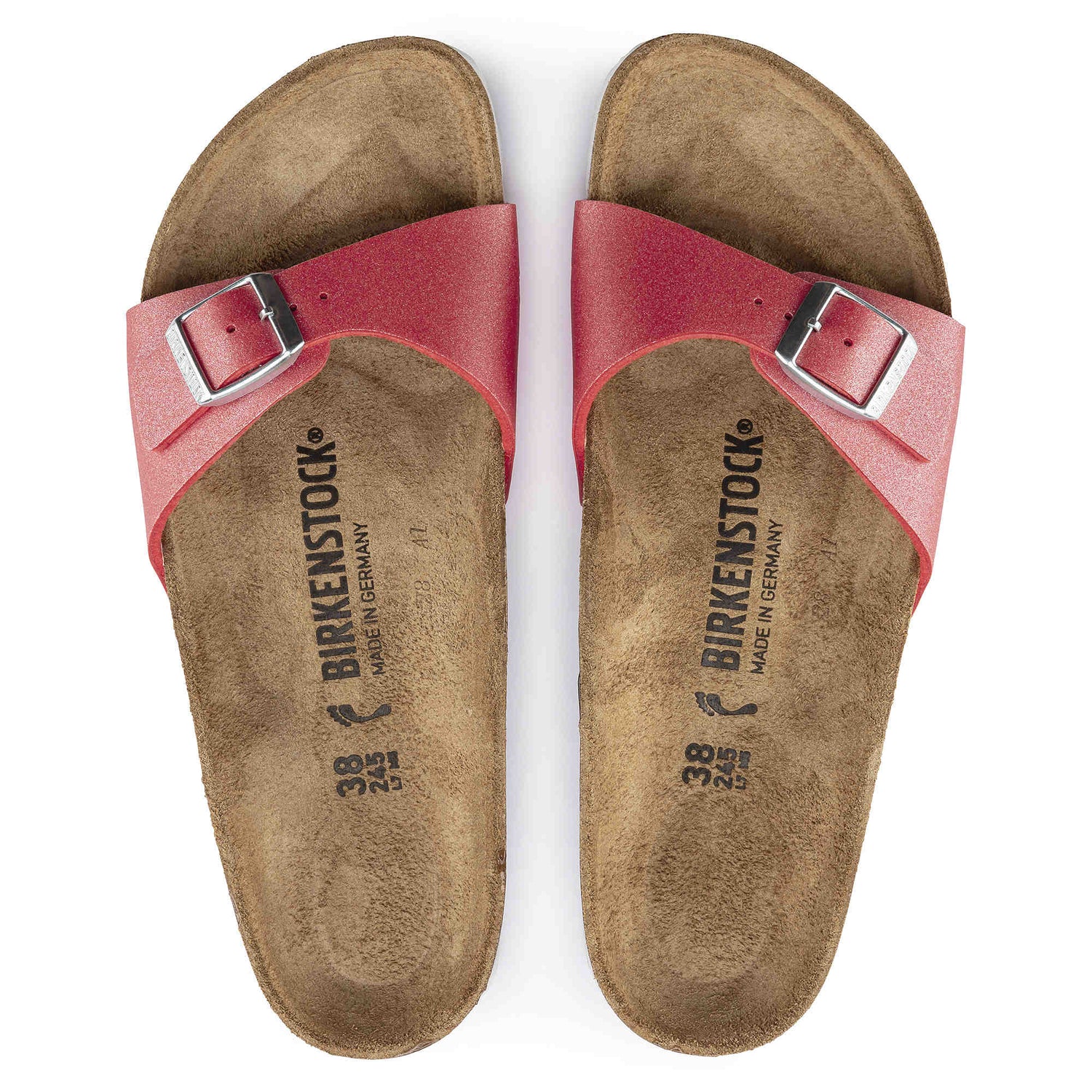 A strap, a buckle and a contoured cork footbed are masterfully combined to create the original Birkenstock Madrid Birko-Flor Icy Metallic Poppy Sandal. Available in vegan materials and includes an upper made from the skin-friendly, hard-wearing synthetic material, Birkibuc.
