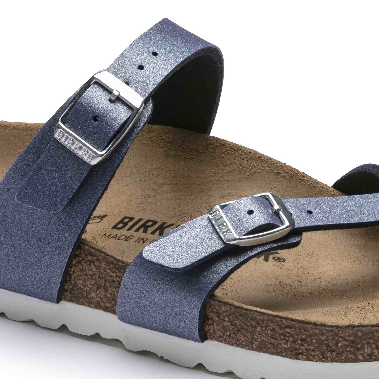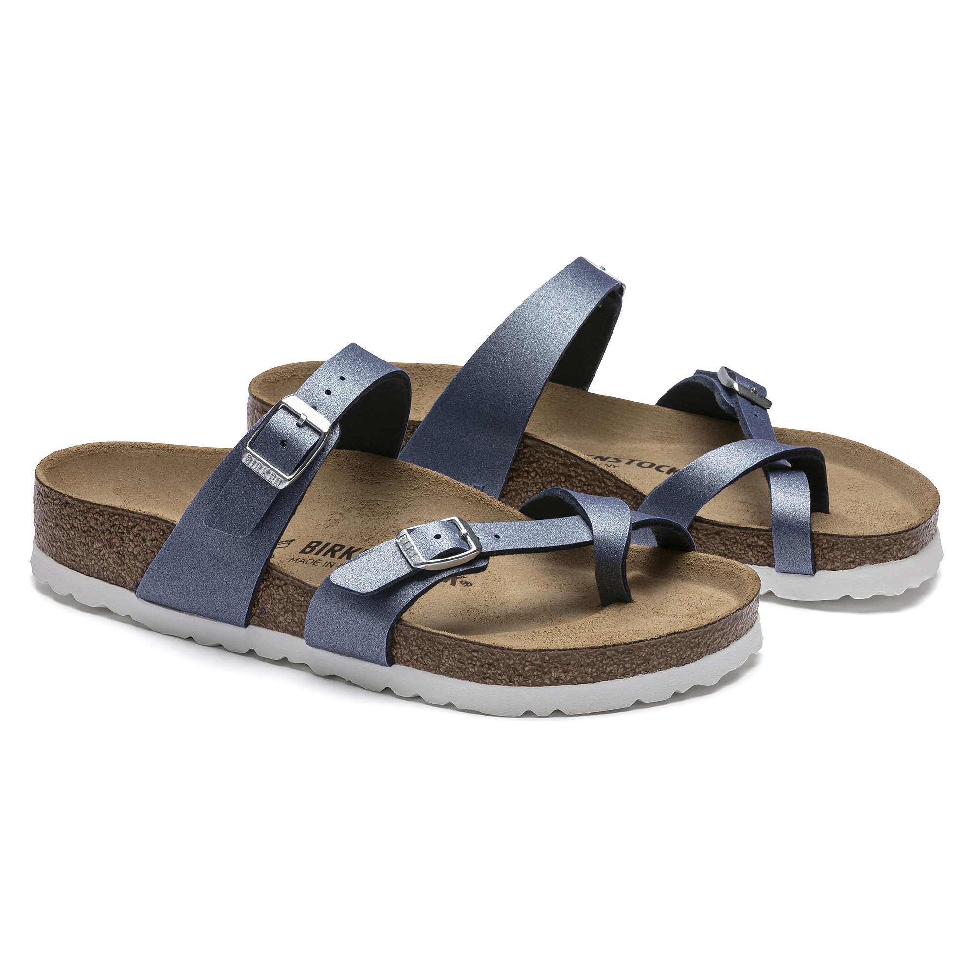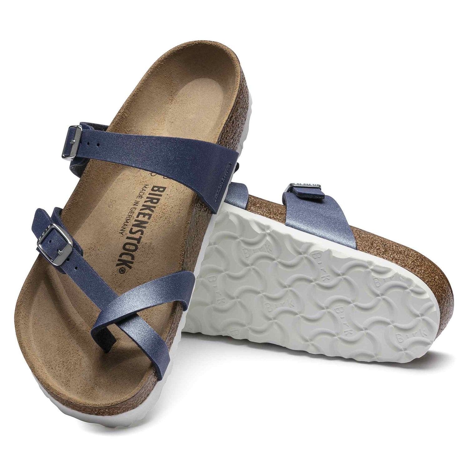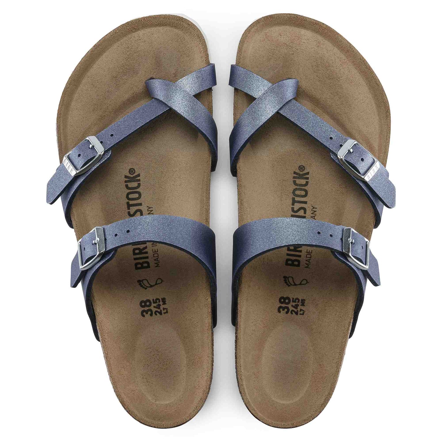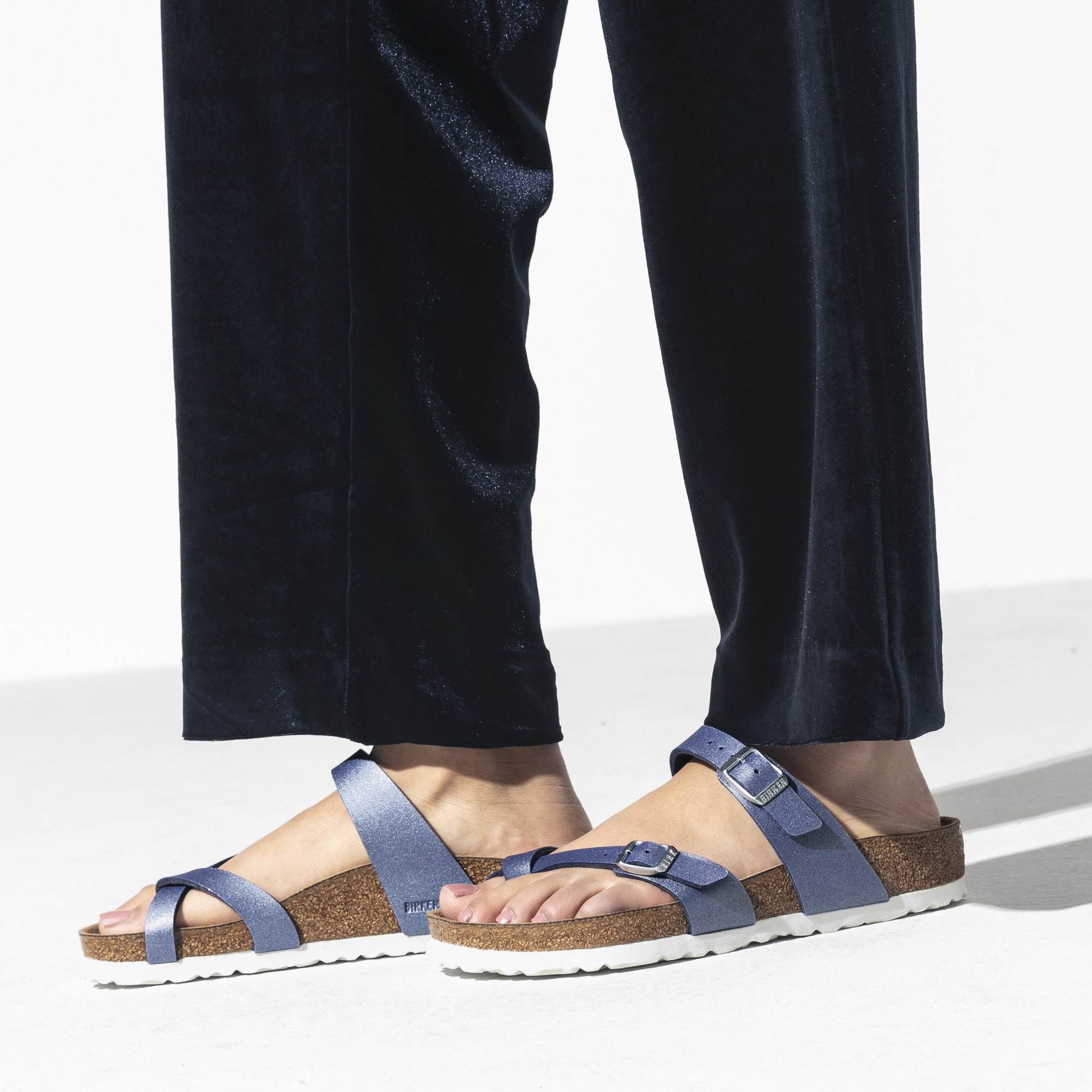 Jaunty and modern! The BIRKENSTOCK Mayari thong sandal stands out with its flowing look and brings together design and comfort. This version is for anyone who likes a bit of sparkle while still maintaining a more understated look. The matte glitter effect is subtle, but still catches the eye. The upper is made from the skin-friendly, hard-wearing synthetic material Birko-Flor®.