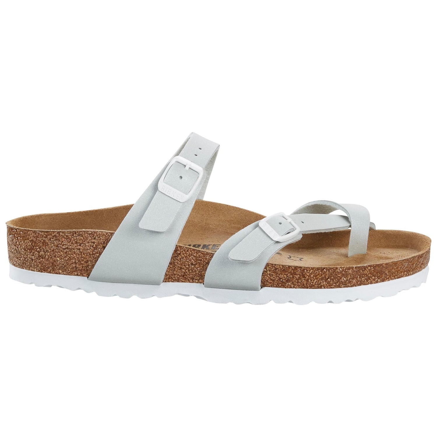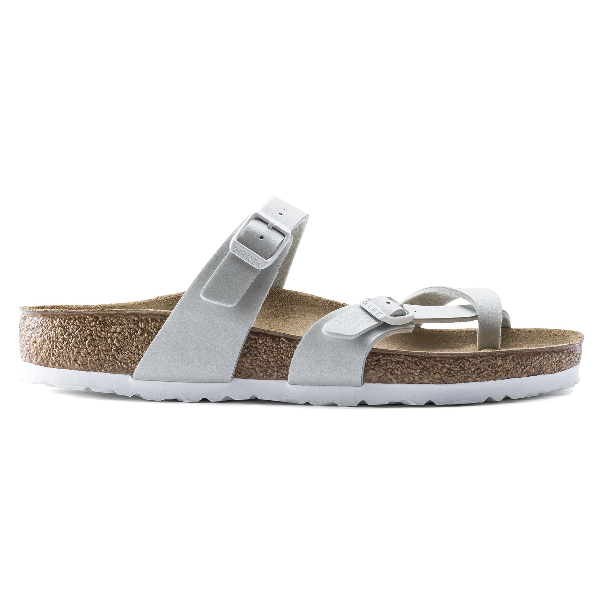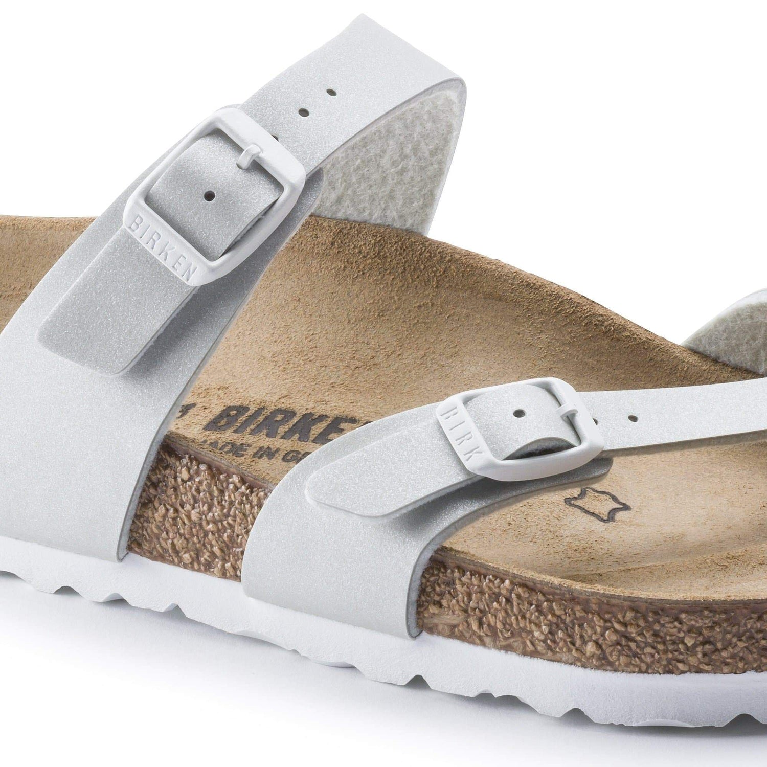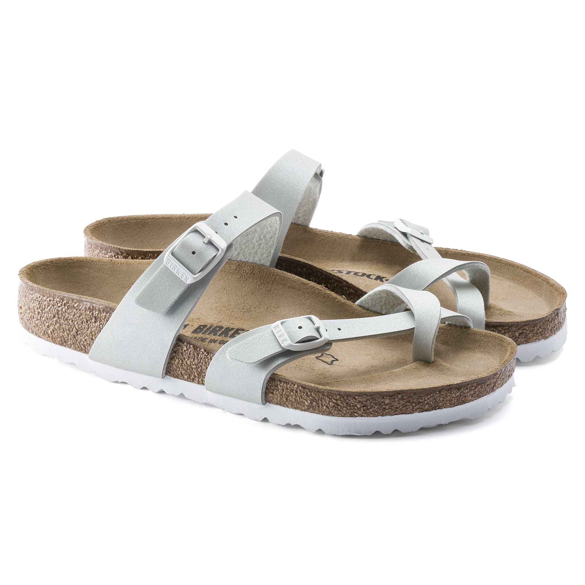 Jaunty and modern! The BIRKENSTOCK Mayari thong sandal stands out with its flowing look and brings together design and comfort. This version is for anyone who likes a bit of sparkle while still maintaining a more understated look. The matte glitter effect is subtle, but still catches the eye. The upper is made from the skin-friendly, hard-wearing synthetic material Birko-Flor®.