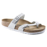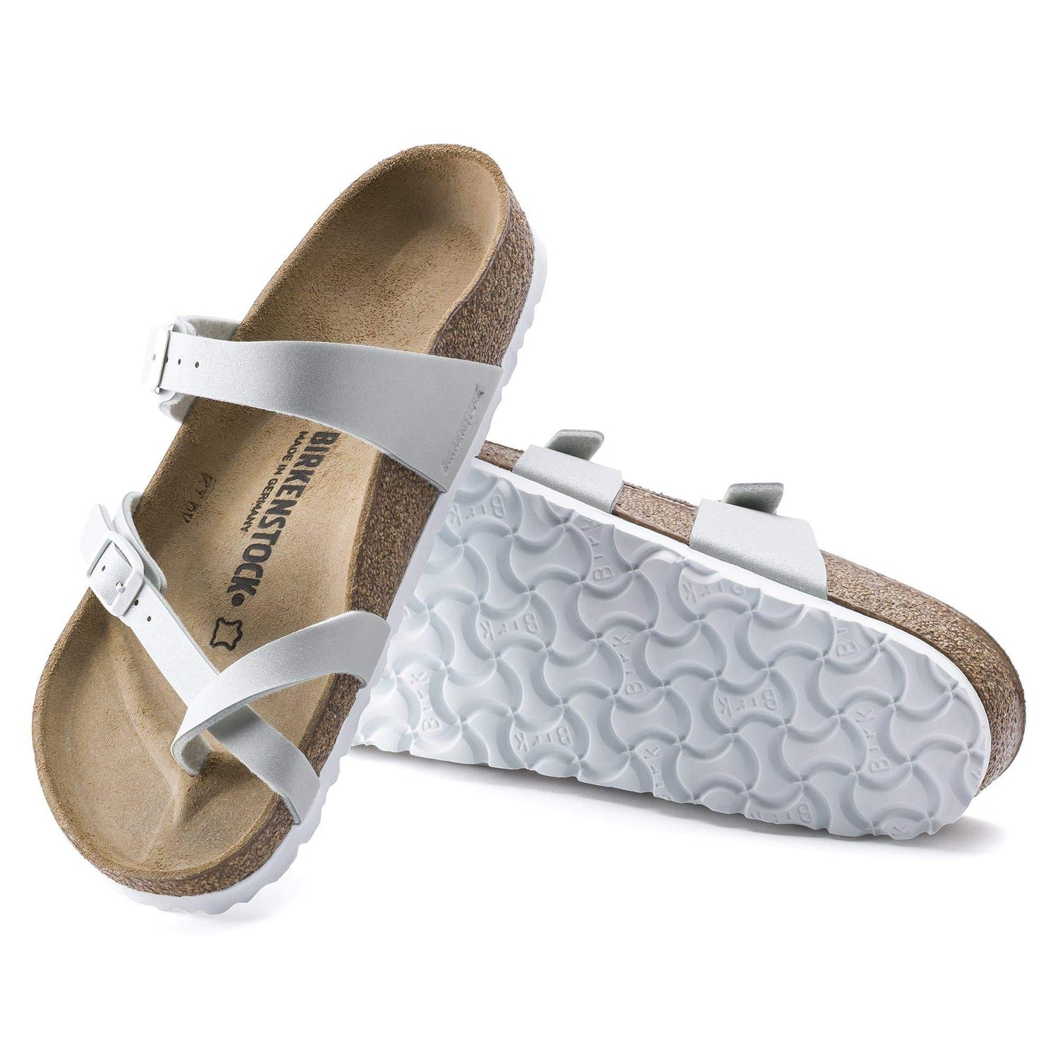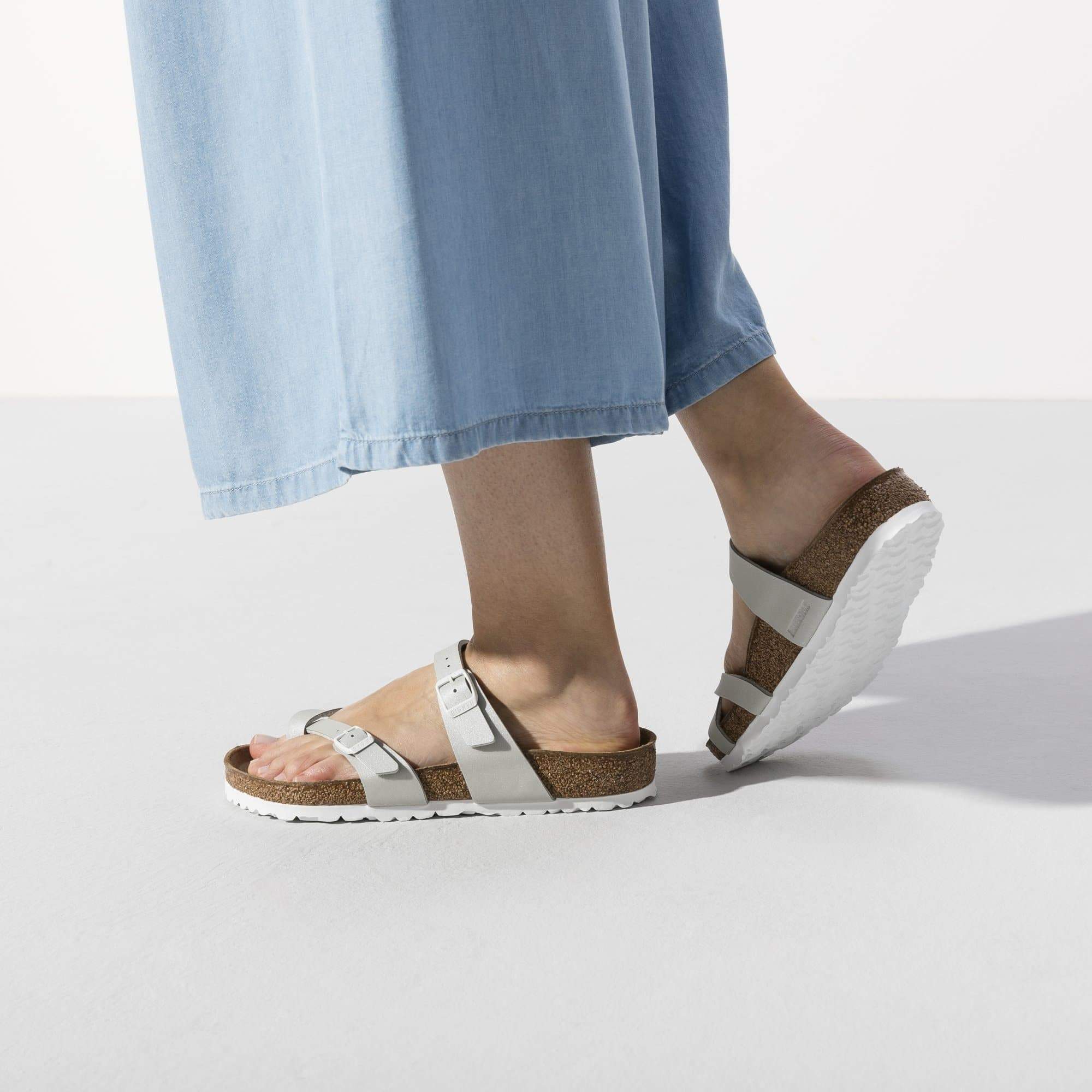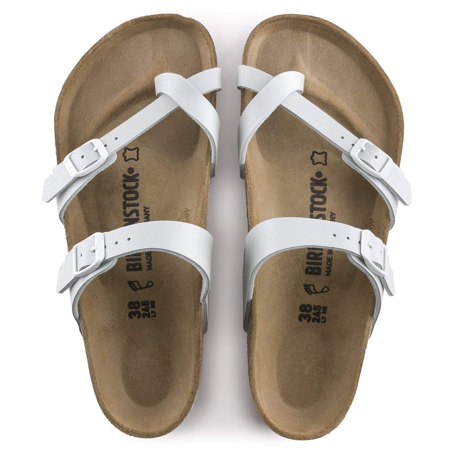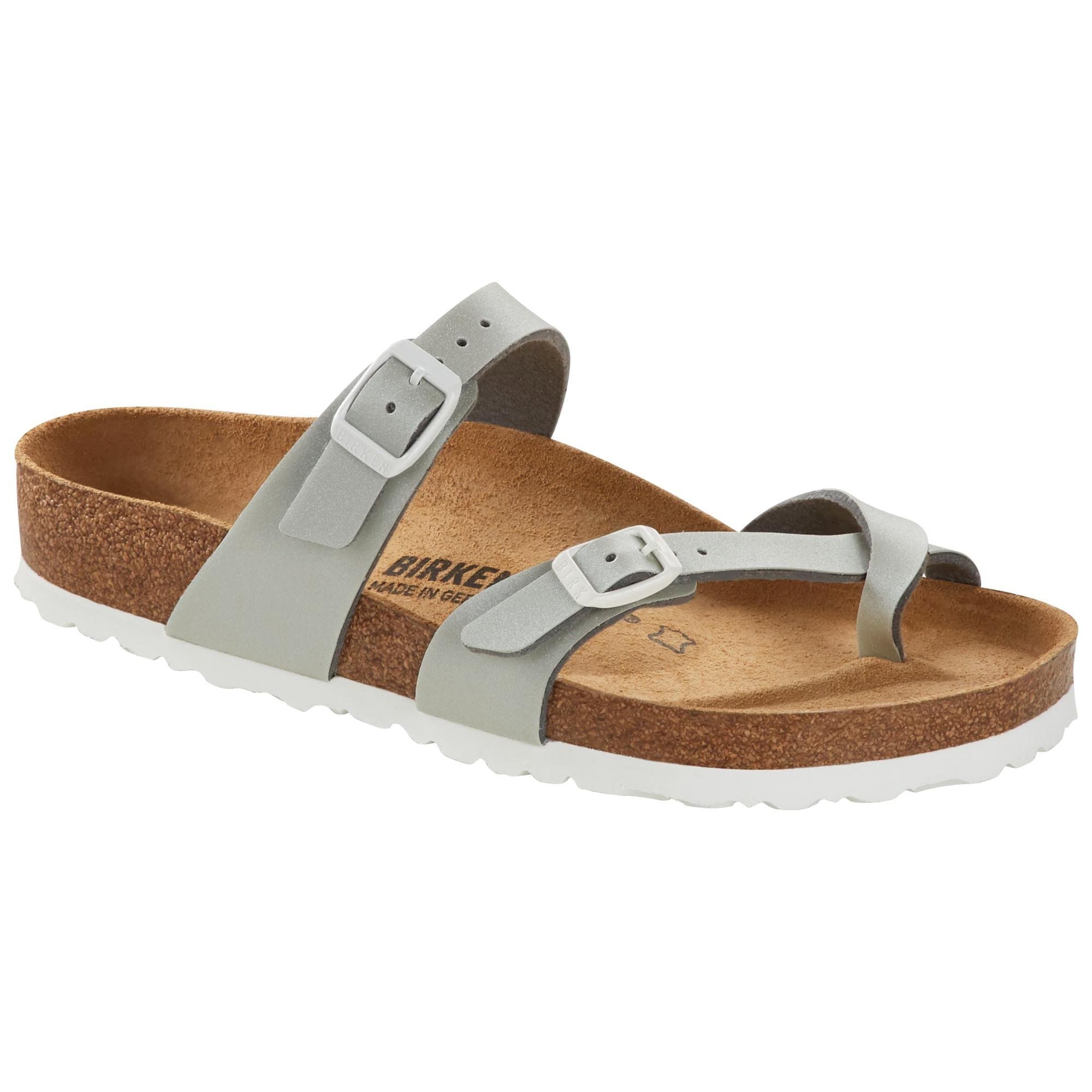 Jaunty and modern! The BIRKENSTOCK Mayari thong sandal stands out with its flowing look and brings together design and comfort. This version is for anyone who likes a bit of sparkle while still maintaining a more understated look. The matte glitter effect is subtle, but still catches the eye. The upper is made from the skin-friendly, hard-wearing synthetic material Birko-Flor®.