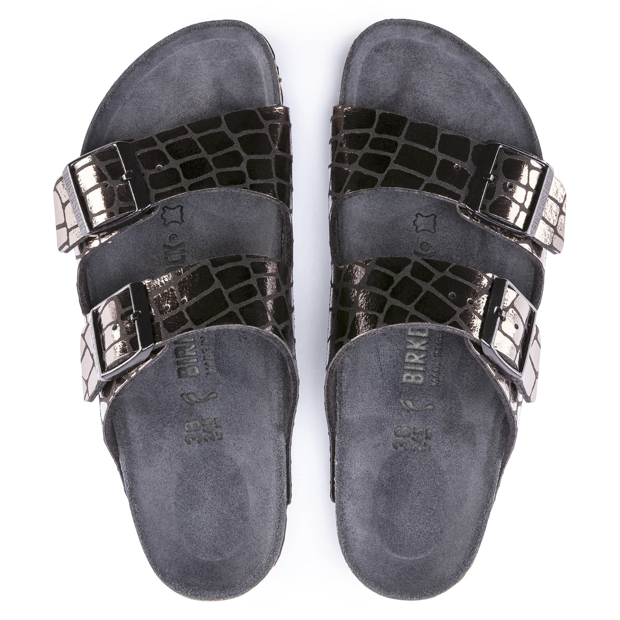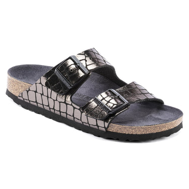 The BIRKENSTOCK Arizona is a genuine classic that has been delighting both men and women with its timeless design for decades. This version sports an alligator pattern and an eye-catching microfiber material made with a matte base combined with a shiny-effect film. Inspired by nature, no two shoes have the same look and feel. The color-coordinated footbed rounds off the shoe look of sophistication. The upper is made from skin-friendly microfiber.