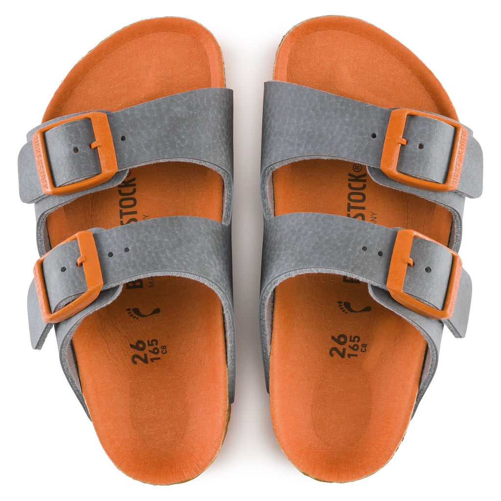 The BIRKENSTOCK Arizona Kids Birko-Flor Desert Soil Vibrant Gray Sandals a genuine classic that has been delighting wearers with its timeless design for decades. The two-strap model fits kids feet perfectly even during boisterous play! The upper is made from the skin-friendly, hard-wearing synthetic material Birko-Flor®. Here, the sophisticated interplay of contrasts gives the classic model a new look which could almost be mistaken for real leather. The color-coordinated outsole, the footbed, and the buckles round off the shoe look of sophistication.