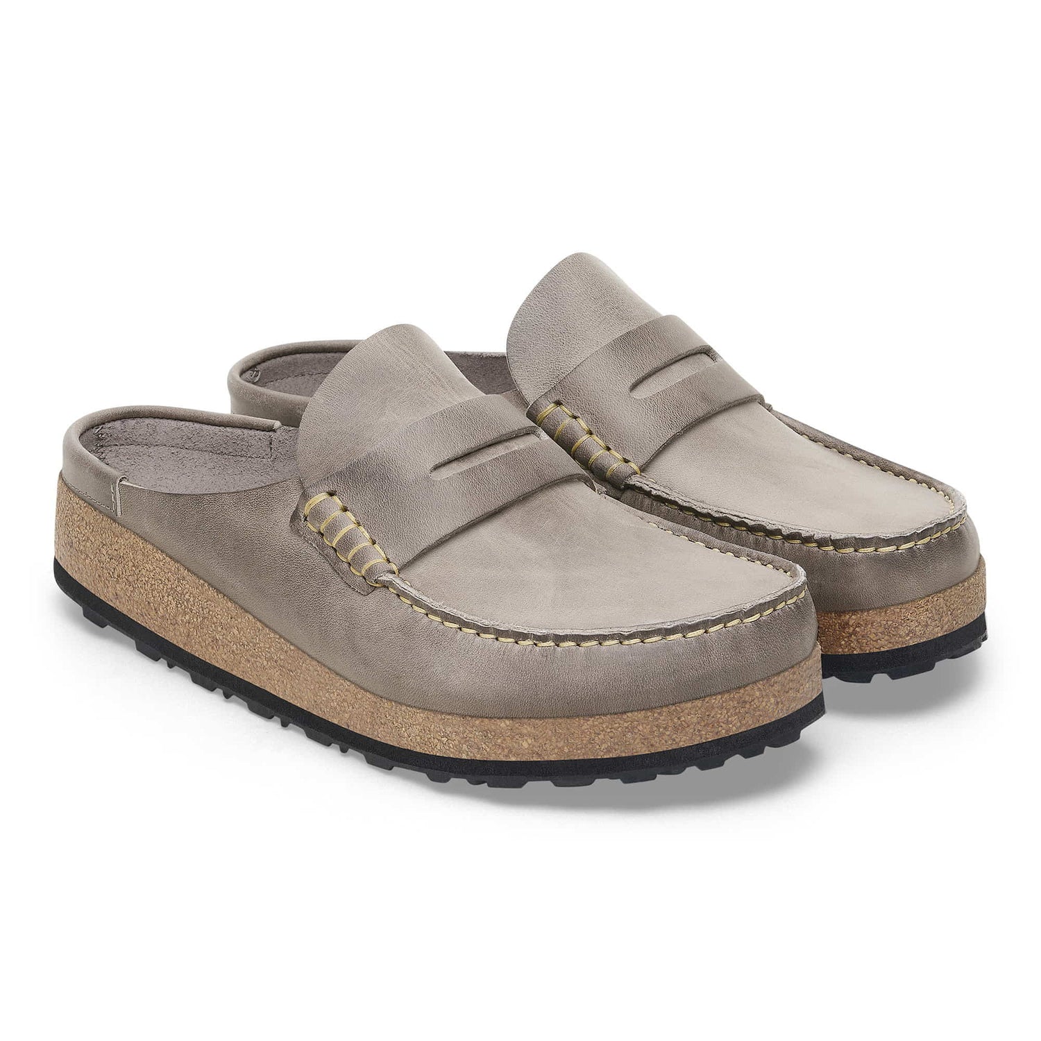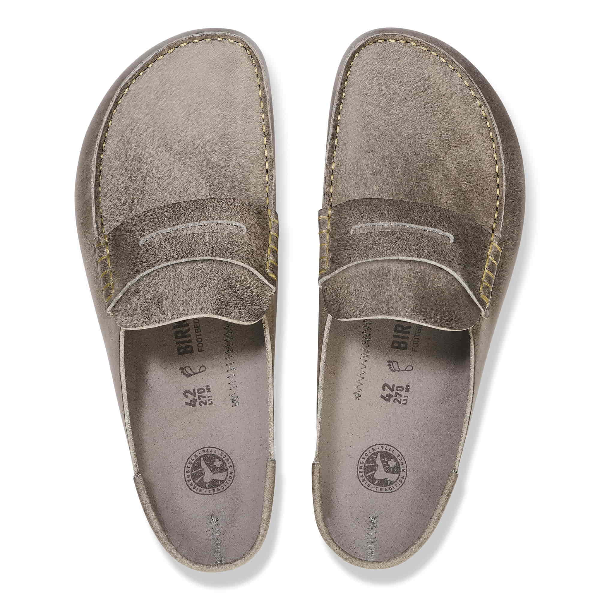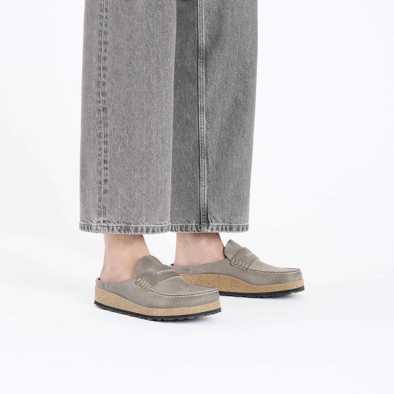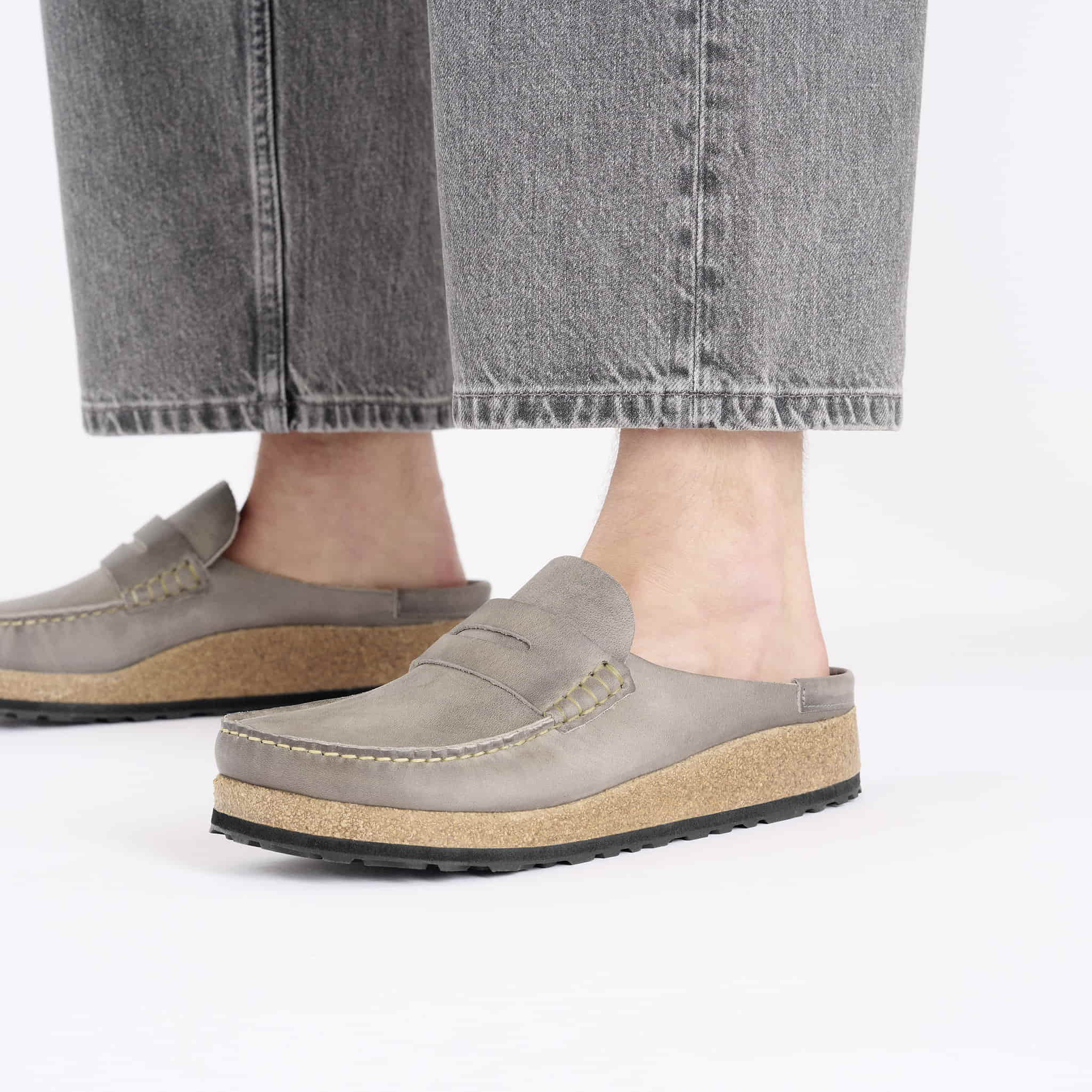 The BIRKENSTOCK Naples is the men’s version of the popular semi-open Buckley clog. The moccasin style with striking stitching lends this sandal a unique and masculine appearance. Thanks to its two components, the sole promotes stability and comfort. It comprises a cushioning midsole made from EVA and an outsole made from genuine rubber. The upper is made from extra thick, oiled nubuck leather with an open-selvage finish.