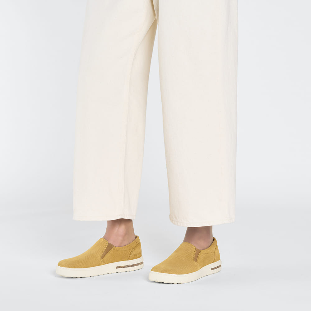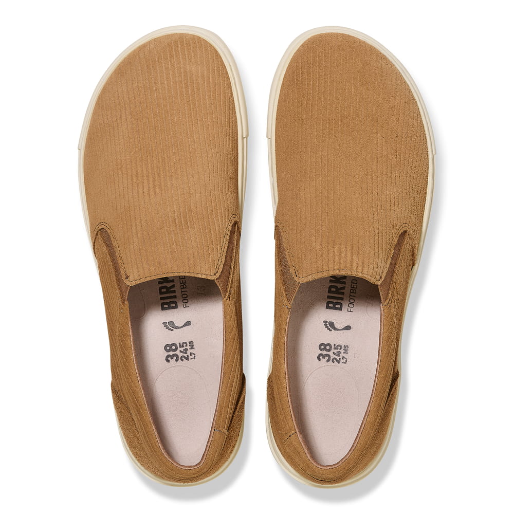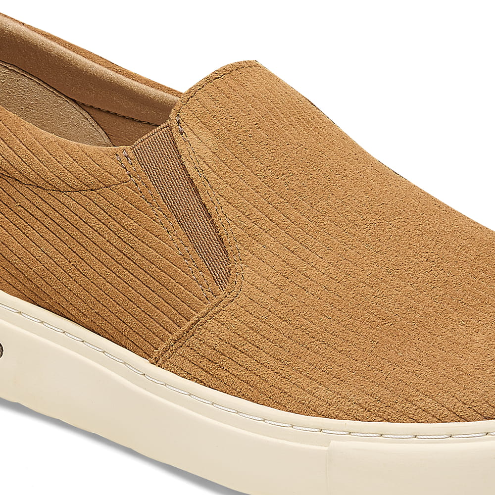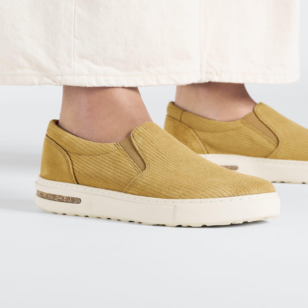 Just slip in! The BIRKENSTOCK Oswego is a handy slip-on shoe that will delight both men and women alike. The casual low shoe features elastic inserts which make it easy to put it on and take it off in no time. The flexible rubber sole with a shock-absorbing cork-PU intermediate layer and the padding at the edge of the shaft result in even more comfort. This version boasts a casual corduroy style. Perfect for authentic streetstyle outfits! The upper is made from soft, embossed suede.