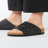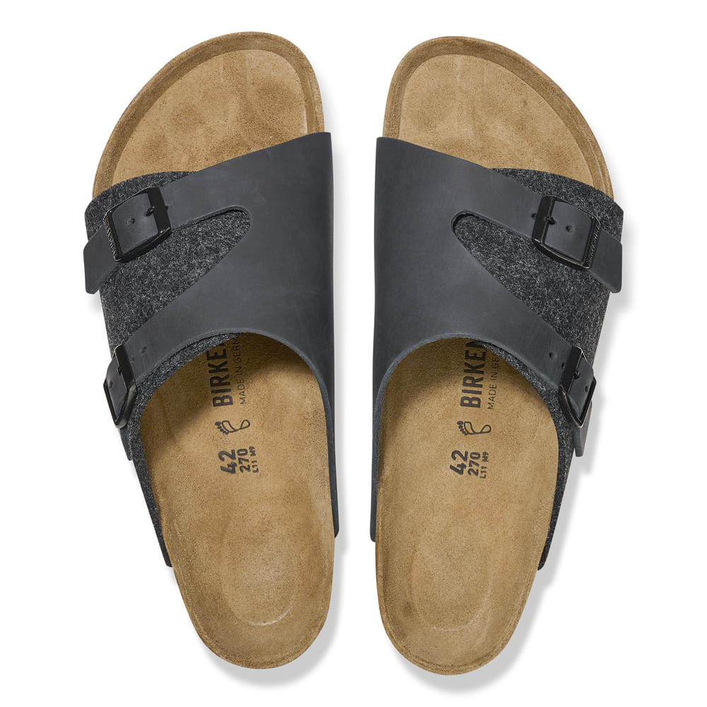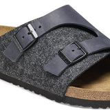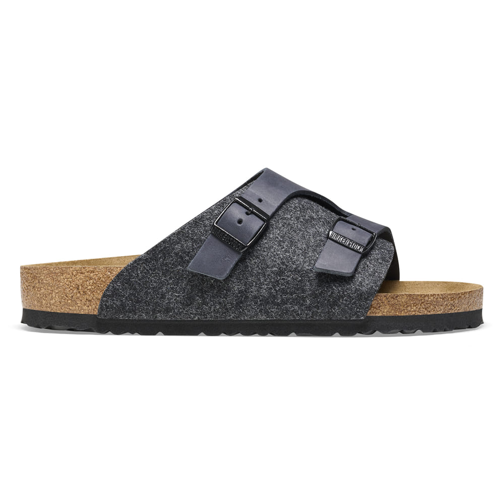 The BIRKENSTOCK Zurich combines the stability of a closed-toe shoe with the lightness of a sandal and is popular in equal measure among both men and women. Although closed at the sides, this version is open at the toes and heel to ensure the feet get enough fresh air. This version boasts an authentic and rustic mix of materials featuring soft synthetic felt and thick natural leather.