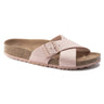 The BIRKENSTOCK Siena boasts a refined appearance. Crossed straps give the sandal its unique and special look. This popular sandal has been given an update in a new material, with a vegan version now available. It is entirely free of animal products, as verified by independent testing laboratories. The color-coordinated buckles with a textile feel and a matte design as well as the color-coordinated outsole are additional eye-catchers. The upper is made from a soft fabric.