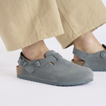 The BIRKENSTOCK Tokio clog is a variation of the classic Boston. The model is characterized by its ankle strap and can easily be worn any time of the year. The upper is made from especially soft suede which hugs the foot like a second skin.
