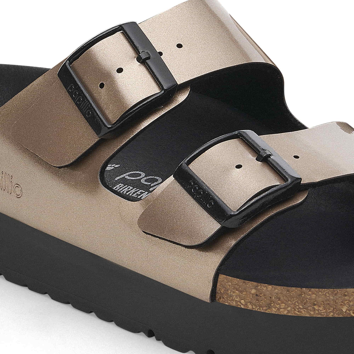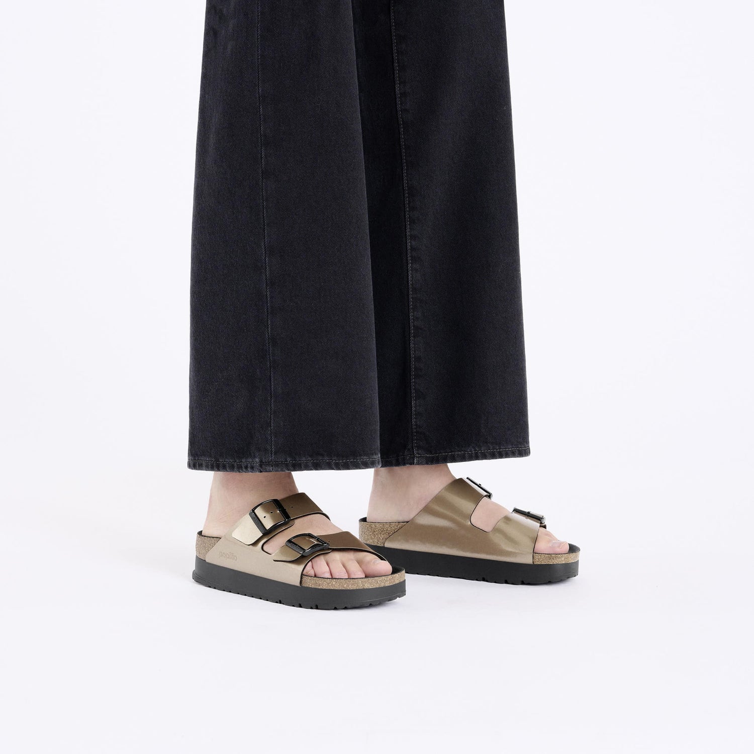The BIRKENSTOCK Arizona is a genuine classic that has been delighting both men and women for decades. This simple sandal with two straps stands for timeless design and has long held cult status thanks to its comfort factor. Here, Papillio presents the two-strap sandal with a new platform flex outsole. The improved outsole features an extended heel for better stability and weight distribution. An overhauled design with horizontal grooves at the front helps to optimize flexibility and the foot’s rolling motion. The upper is made from the skin-friendly, hard-wearing synthetic material Birko-Flor® with a shiny patent coating.