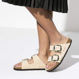 The BIRKENSTOCK Arizona is a genuine classic that has been delighting both men and women with its timeless design for decades. The Big Buckle version features a large, printed pin buckle a fantastic, striking eye-catcher. The color-coordinated footbed rounds off the shoes look of sophistication. The upper is made from high-quality, soft nubuck leather that boasts a natural, rustic appearance.