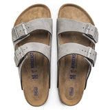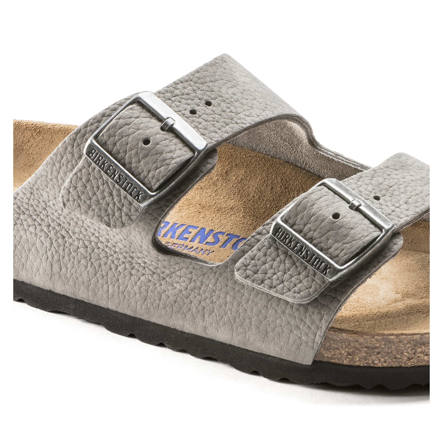 The BIRKENSTOCK Arizona Soft Footbed Nubuck Leather Desert Buck Whale Gray Sandals a genuine classic that has been delighting both men and women with its timeless design for decades. This version with its grained upper boasts a striking yet natural design. With its additional foam layer, the soft footbed offers extra comfort and pampers feet all day long. The upper is made from high-quality, soft nubuck leather that boasts a natural, rustic appearance.