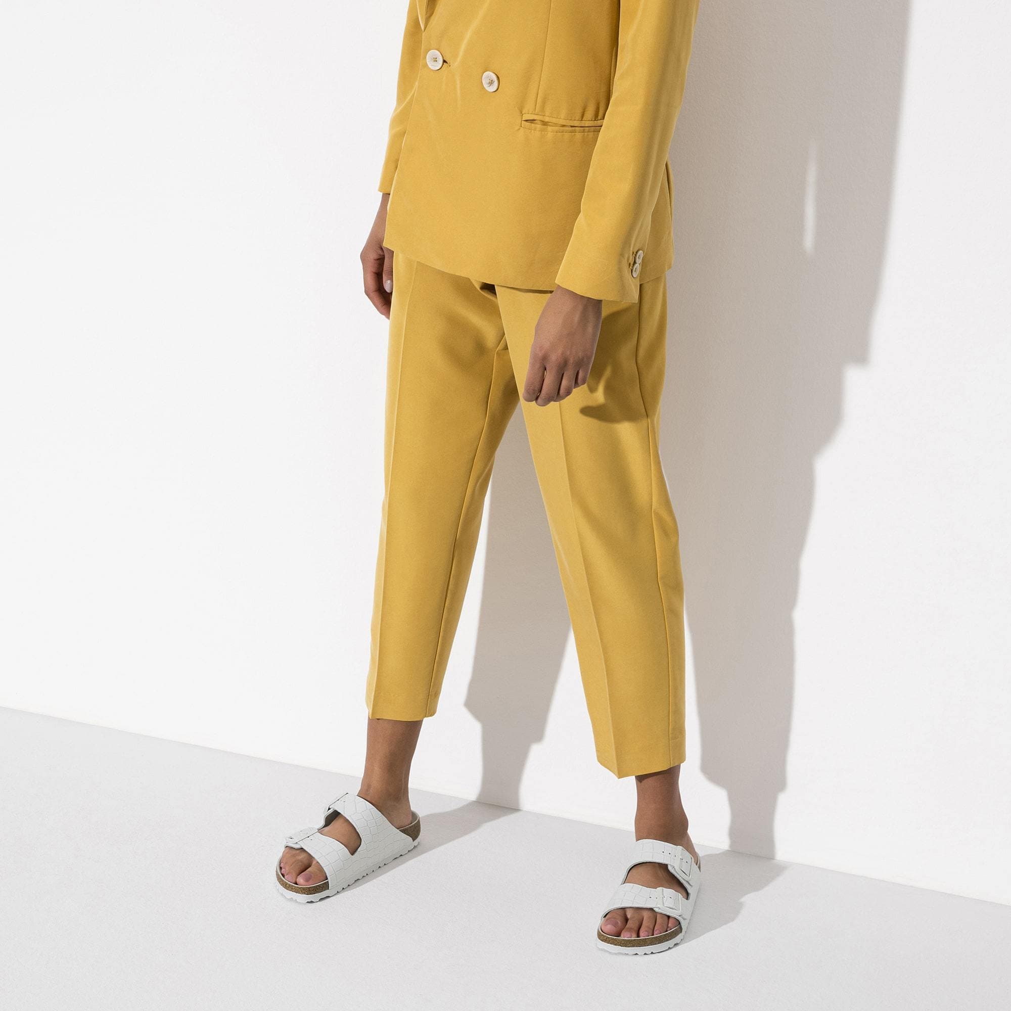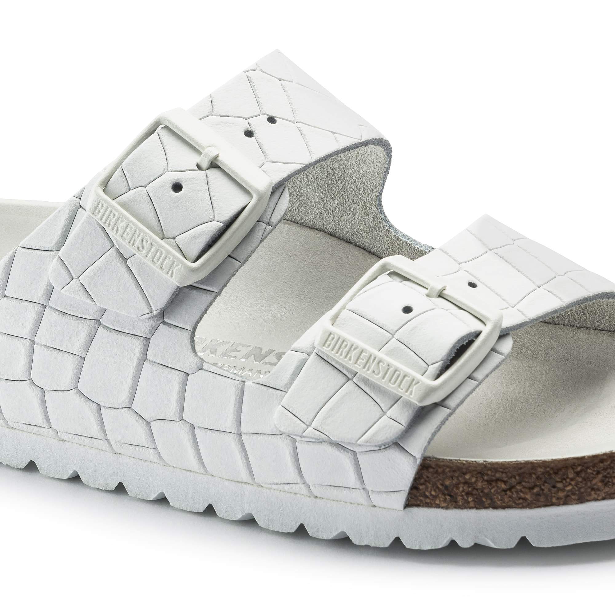 The BIRKENSTOCK Arizona Embossed Natural Leather White and Black Sandals a genuine classic that has been delighting both men and women with its timeless design for decades. In this version, the classic sandal was reinterpreted with an embossed alligator design. It boasts a tone-on-tone appearance. Inspired by nature, no two shoes have the same look and feel. The lining of the semi-exquisite footbed is covered with soft smooth leather and matches the shoe in color. The color-coordinated pin buckles round off the shoe's look of sophistication. The upper is embossed natural leather.