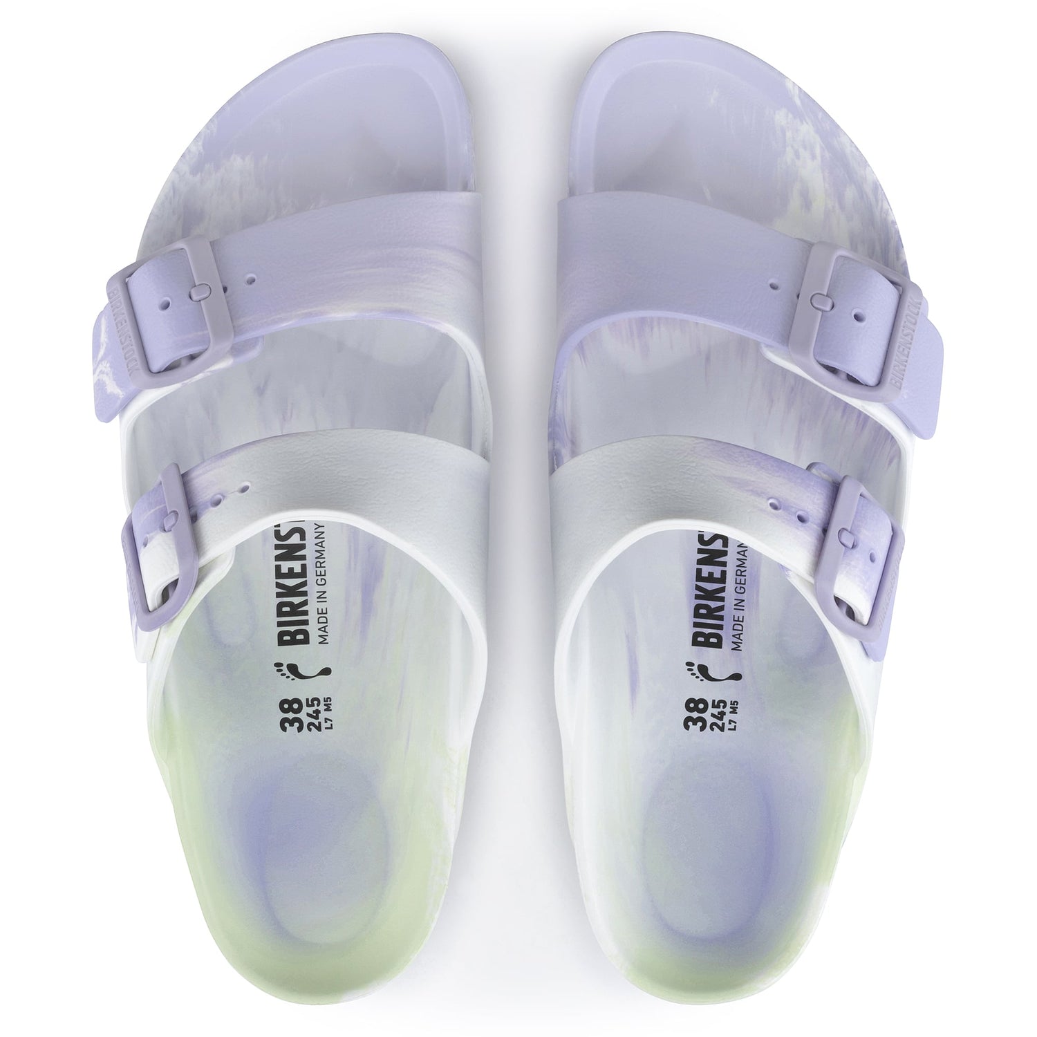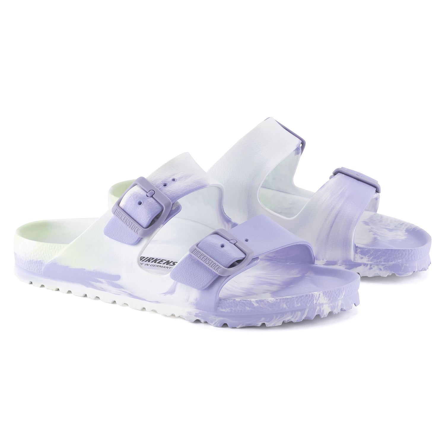 The BIRKENSTOCK Arizona is a genuine classic. Modeled on the cork sandal, this version is made from EVA. The high-quality, odor-neutral EVA has been tested for harmful substances and combines numerous positive attributes. It is ultra lightweight, highly elasticated, waterproof, skin-friendly and offers the comfort you have come to expect from BIRKENSTOCK. The swirl of colors really catches the eye. Thanks to the creative production process during which EVA particles are heated and then melt, no two pairs are the same. The product and the distribution of colors can thus differ from the photo.