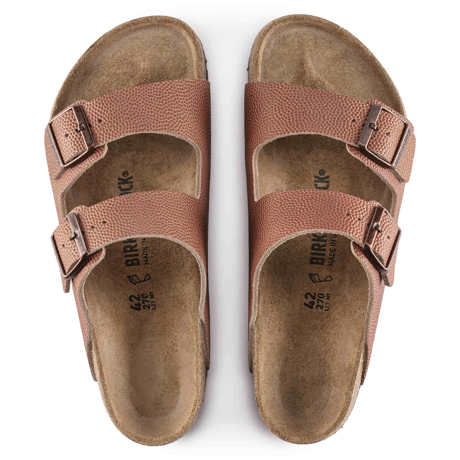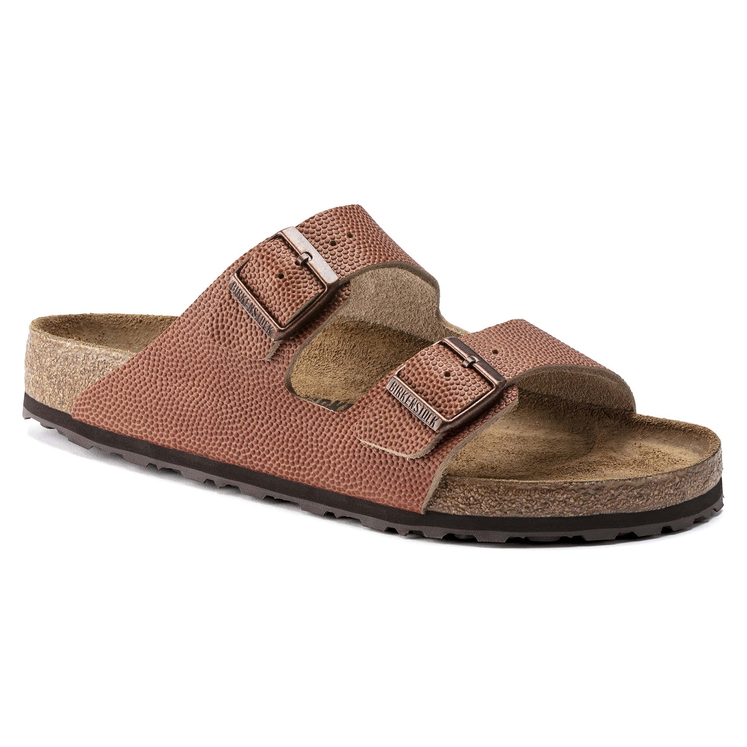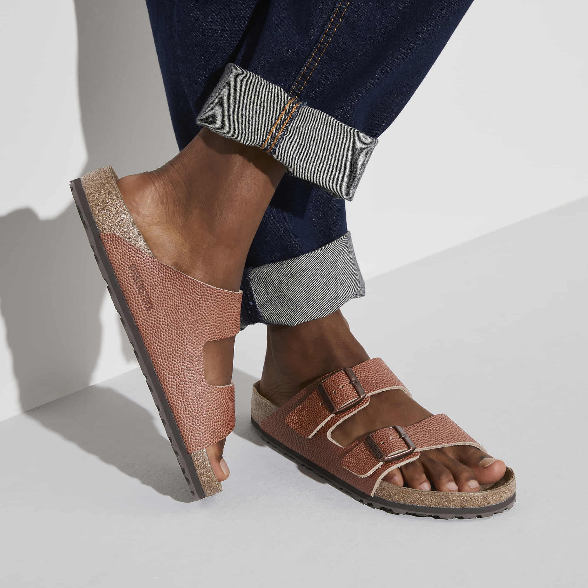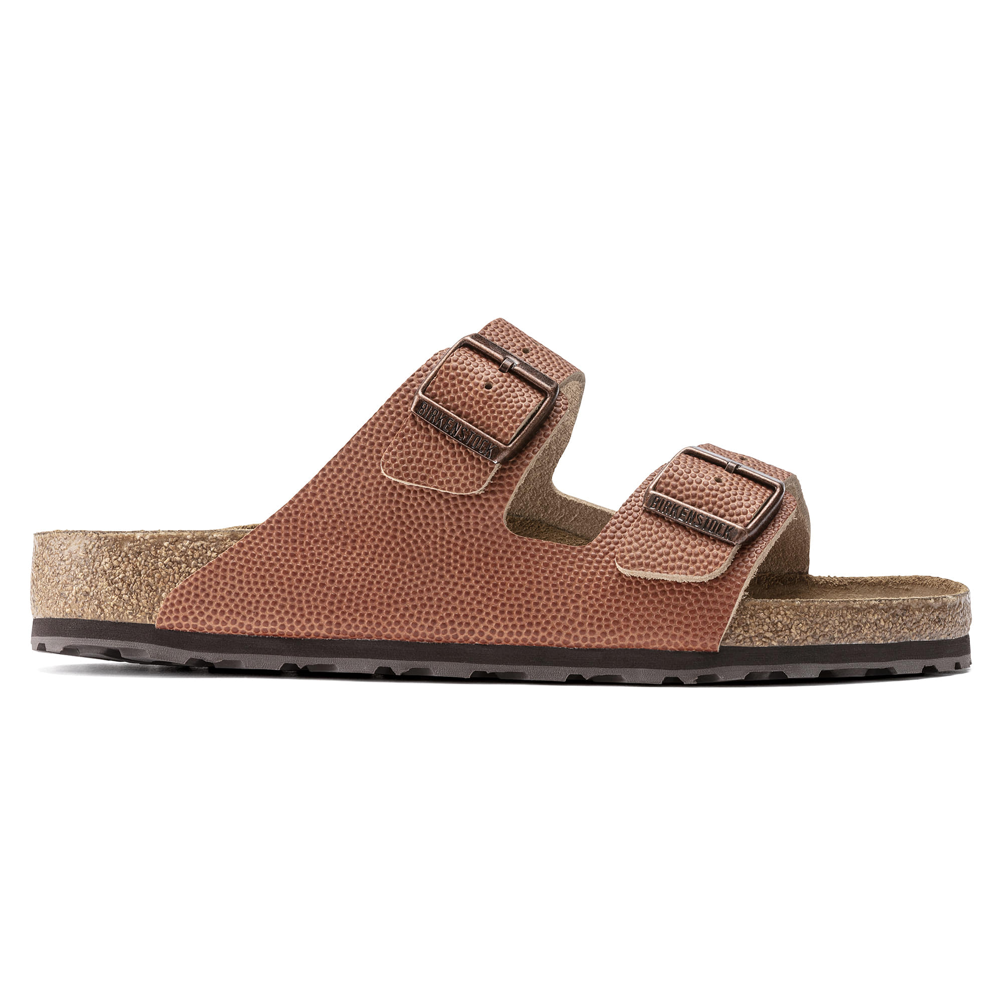 The BIRKENSTOCK Arizona is a genuine classic that has been delighting both men and women with its timeless design for decades. The upper is made from high-quality, soft natural leather. This version boasts a sophisticated interplay of materials in the form of an embossing reminiscent of football. Thanks to its two components, the sole promotes stability and comfort. It comprises a cushioning midsole made from EVA and a slip-resistant outsole made from genuine rubber and rounds off the sporty look.