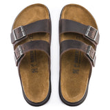 Oiled leather can be recognized by its untreated surface. BIRKENSTOCK purposely does not treat surface grains and other characteristic features. BIRKENSTOCK uses sturdy leather with a thickness of 2.8 to 3.2 millimeters as upper material.