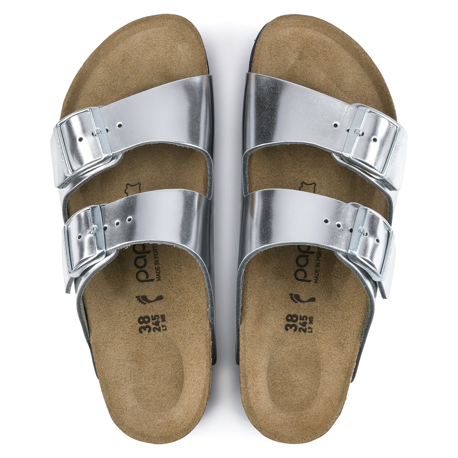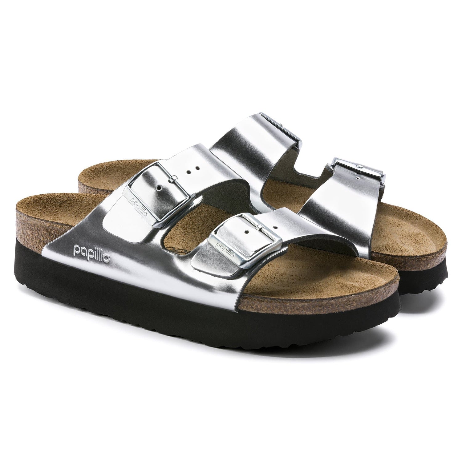 The BIRKENSTOCK Arizona Platform Natural Leather Silver sandal is a genuine classic that has been delighting both men and women for decades. Here, Papillio presents the two-strap sandal with a trendy platform sole. The bevels at the front and back provide for maximum walking comfort. This sandal was reinterpreted in an extravagant metallic look. The reflective film makes this classic model dazzle and is sure to make any outfit turn heads. The color-coordinated tongue buckles round off the shoe's look of sophistication. The upper is made from high-quality, soft natural leather.