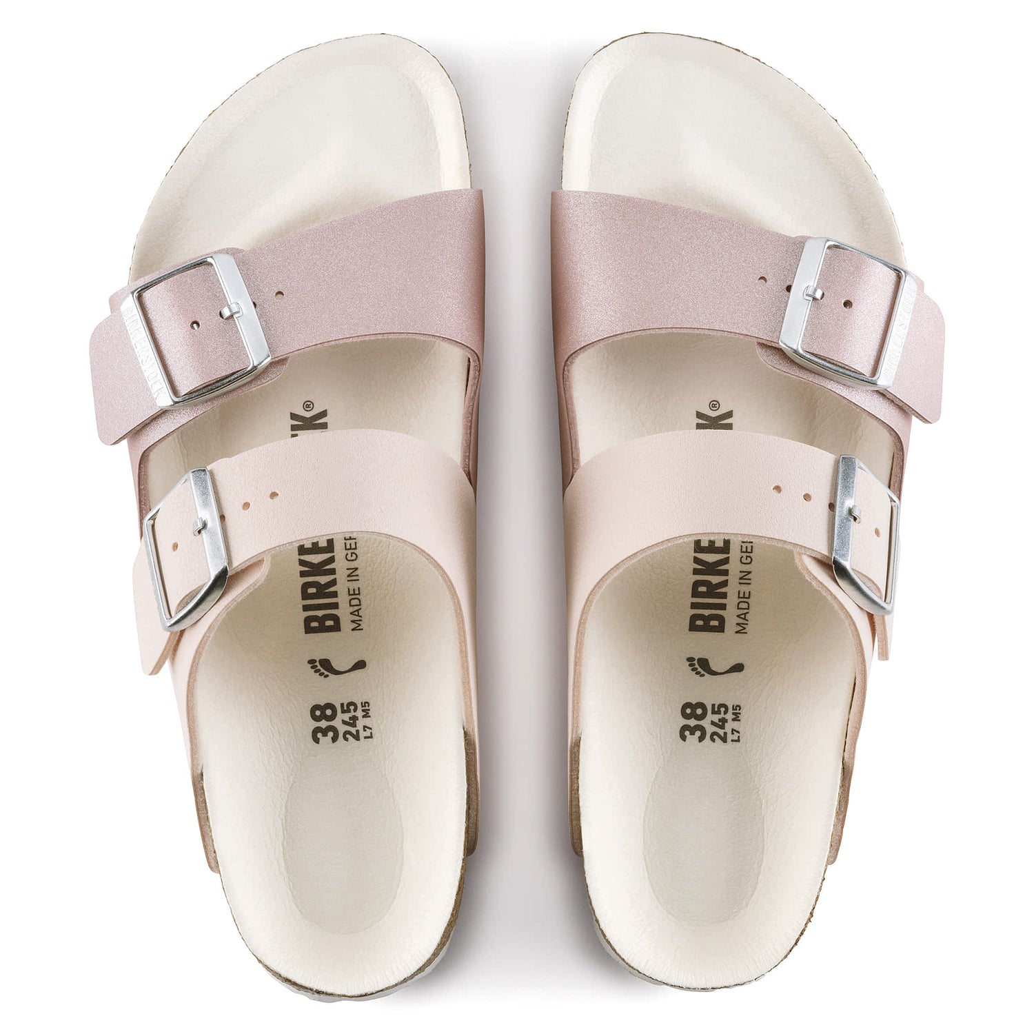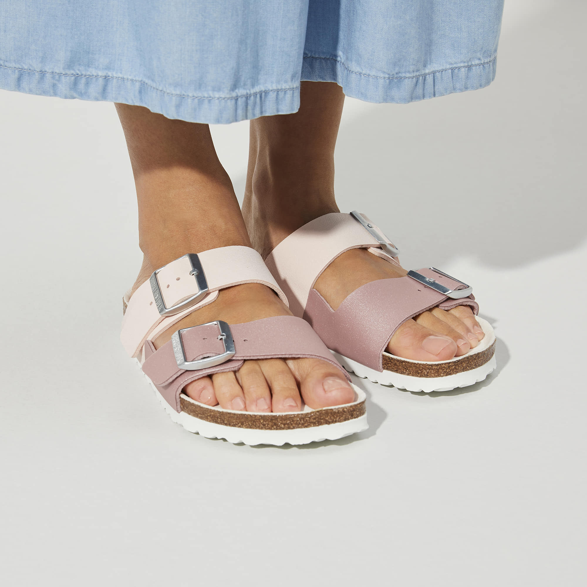 The BIRKENSTOCK Arizona is a genuine classic that has been delighting both men and women with its timeless design for decades. This version of the sandal plays with contrasts and color-blocking, making the sandal shine in metallic shades. The color-coordinated footbed rounds off the shoes look of sophistication. The upper is made from the skin-friendly, hard-wearing synthetic material Birko-Flor®.