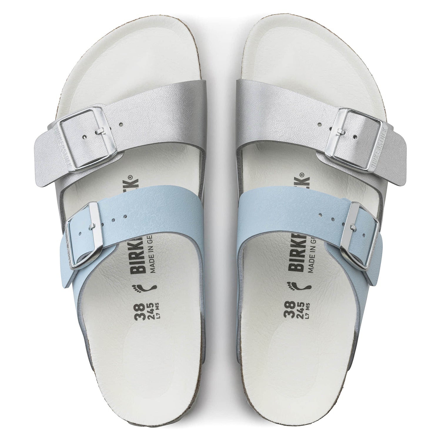 - Details: two straps, each with an individually adjustable metal pin buckle; color-coordinated footbed