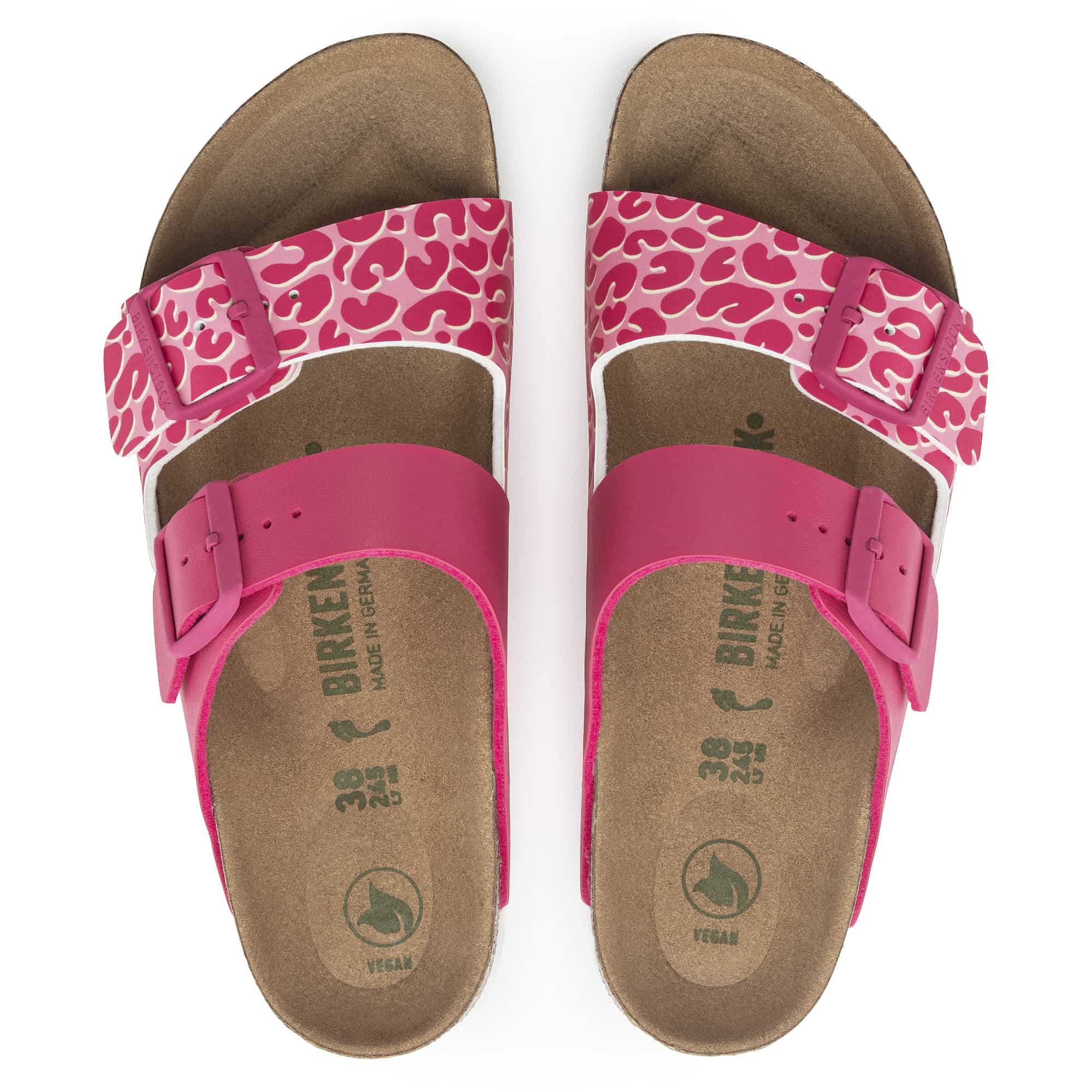 The BIRKENSTOCK Arizona is a genuine classic that has been delighting both men and women with its timeless design for decades. This version is inspired by color blocking and features an exotic print. This popular sandal has been given an update in a new material, with a vegan version now available. It is entirely free of animal products, as verified by independent testing laboratories. The color-coordinated buckles with a textile feel and a matte design are additional eye-catchers. The upper is made from the skin-friendly, hard-wearing synthetic material Birko-Flor®.