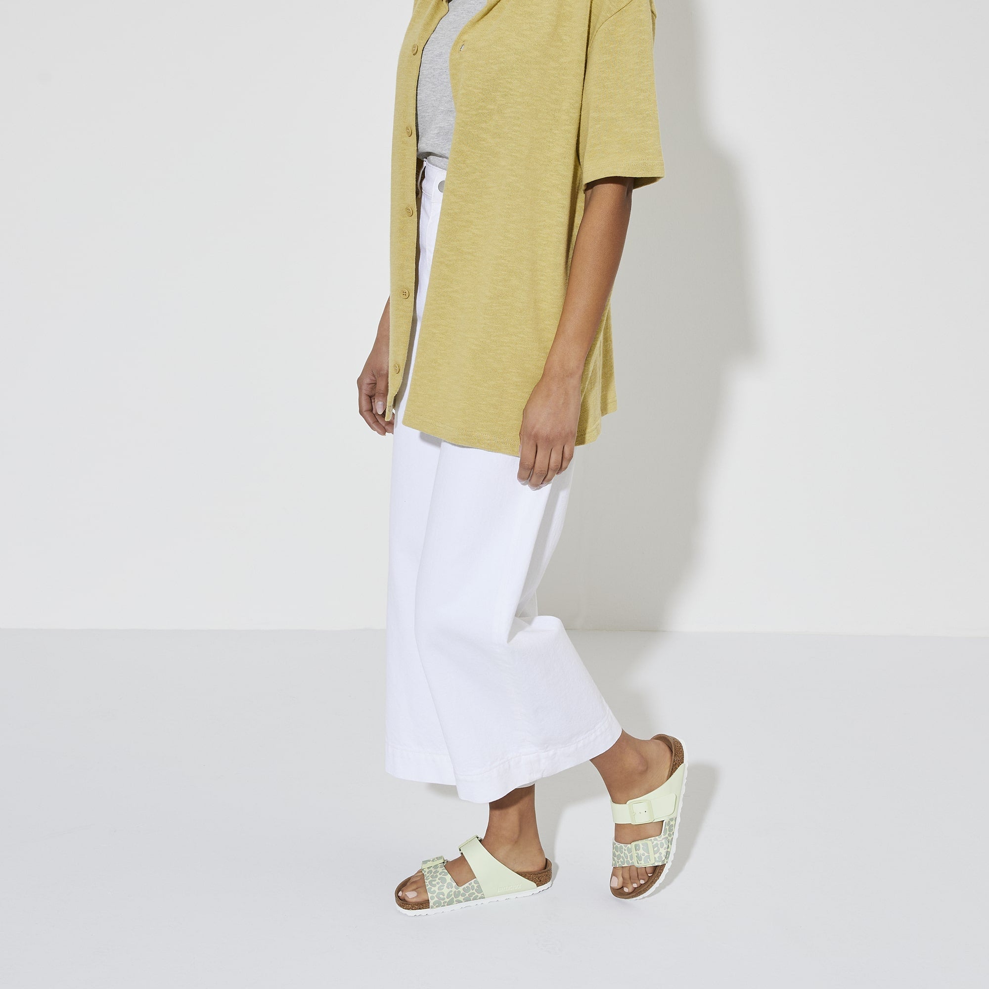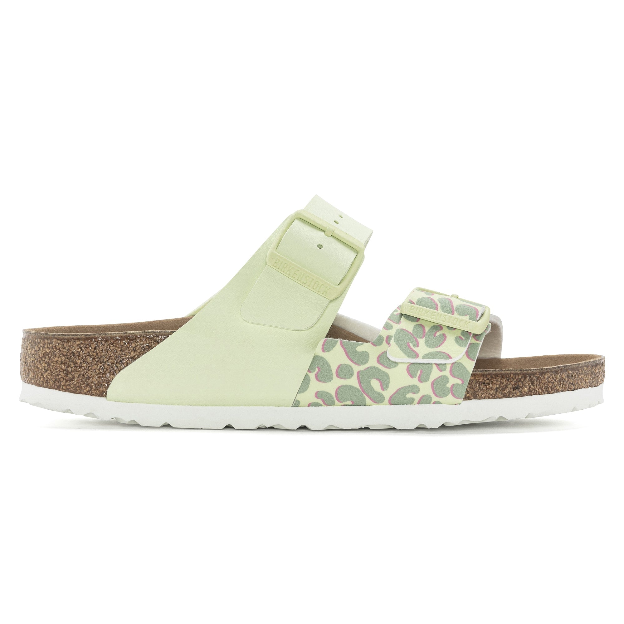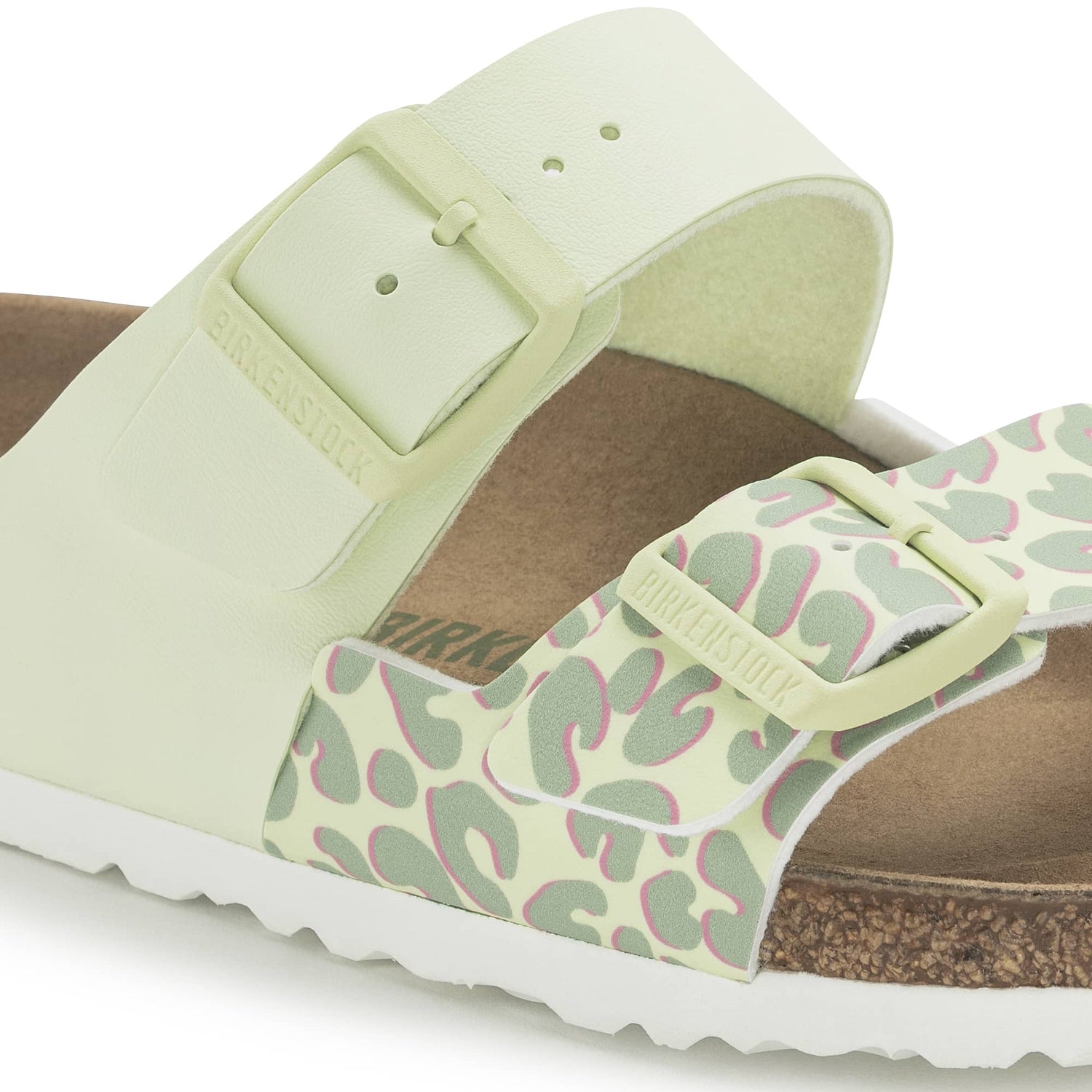 The BIRKENSTOCK Arizona is a genuine classic that has been delighting both men and women with its timeless design for decades. This version is inspired by color blocking and features an exotic print. This popular sandal has been given an update in a new material, with a vegan version now available. It is entirely free of animal products, as verified by independent testing laboratories. The color-coordinated buckles with a textile feel and a matte design are additional eye-catchers. The upper is made from the skin-friendly, hard-wearing synthetic material Birko-Flor®.