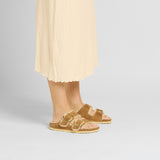 - Details: two straps, each with a big, individually adjustable metal pin buckle; color-coordinated footbed