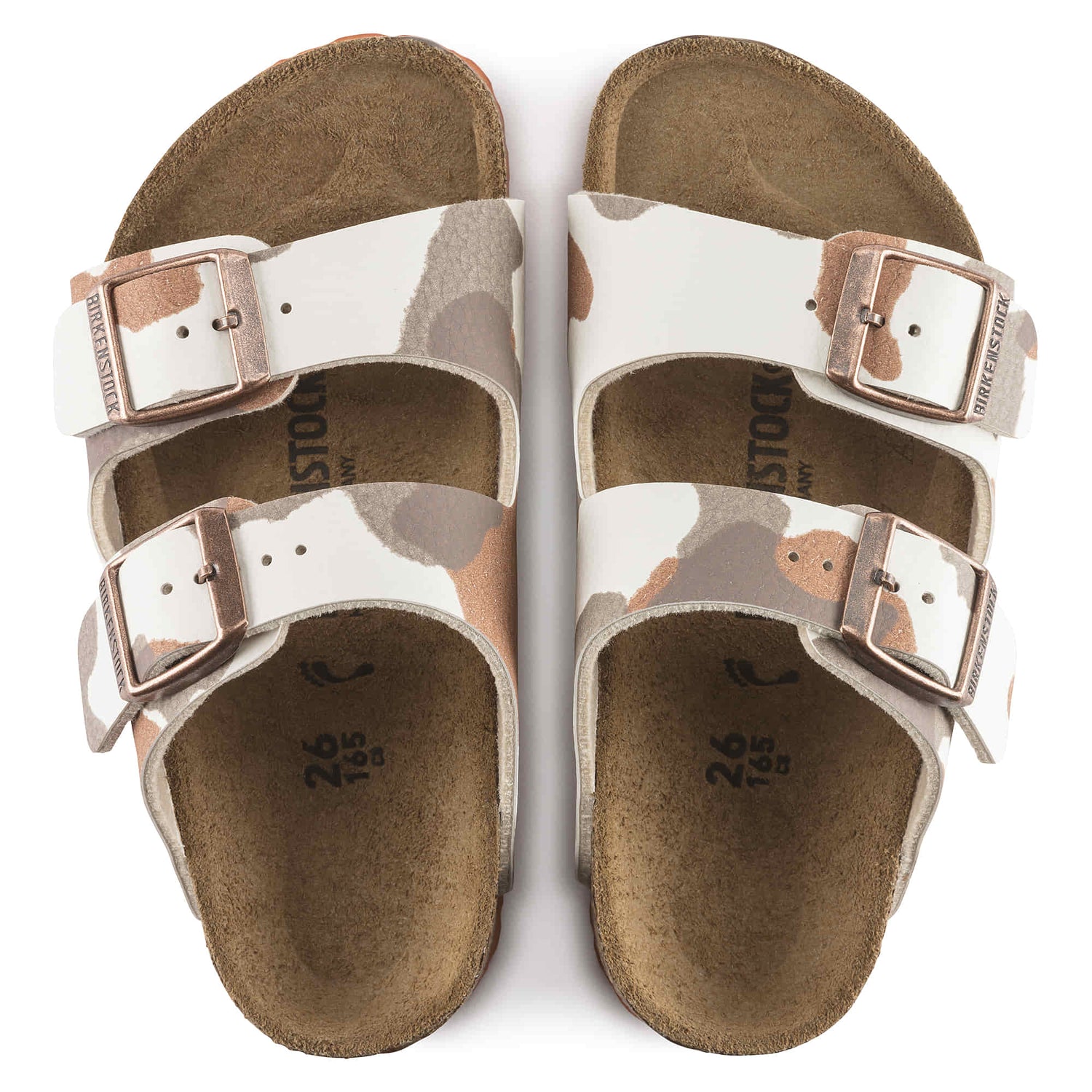 The BIRKENSTOCK Arizona is a genuine classic that has been delighting wearers with its timeless design for decades. The two-strap model fits kids feet perfectly even during boisterous play! This version of the sandal is tone-on-tone, giving it a trendy camouflage look. It could almost be mistaken for real leather. The color-coordinated outsole rounds off the shoes look of sophistication. The upper is made from the skin-friendly, hard-wearing synthetic material Birko-Flor®.
