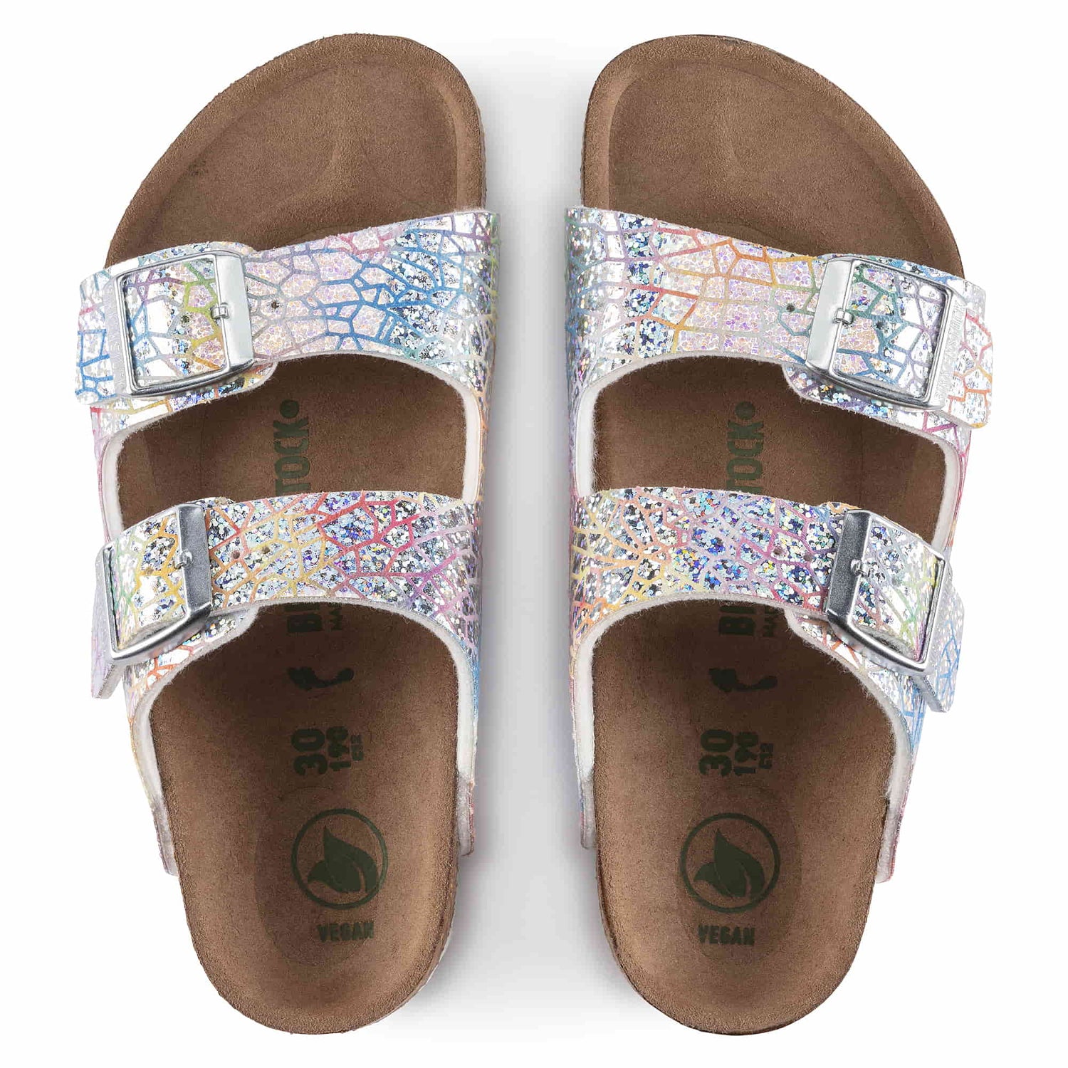 The BIRKENSTOCK Arizona is a genuine classic that has been delighting wearers with its timeless design for decades. The two-strap model fits kids' feet perfectly even during boisterous play! This version comes in a glittering disco design and will make girls' hearts beat faster. A real eye-catcher at school! This popular sandal has been given an update in a new material, with a vegan version now available. It is entirely free of animal products, as verified by independent testing laboratories. The upper is made from skin-friendly microfiber.