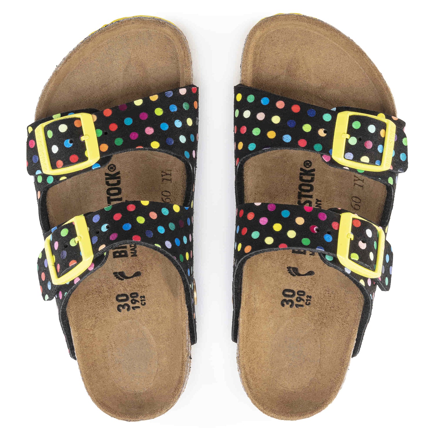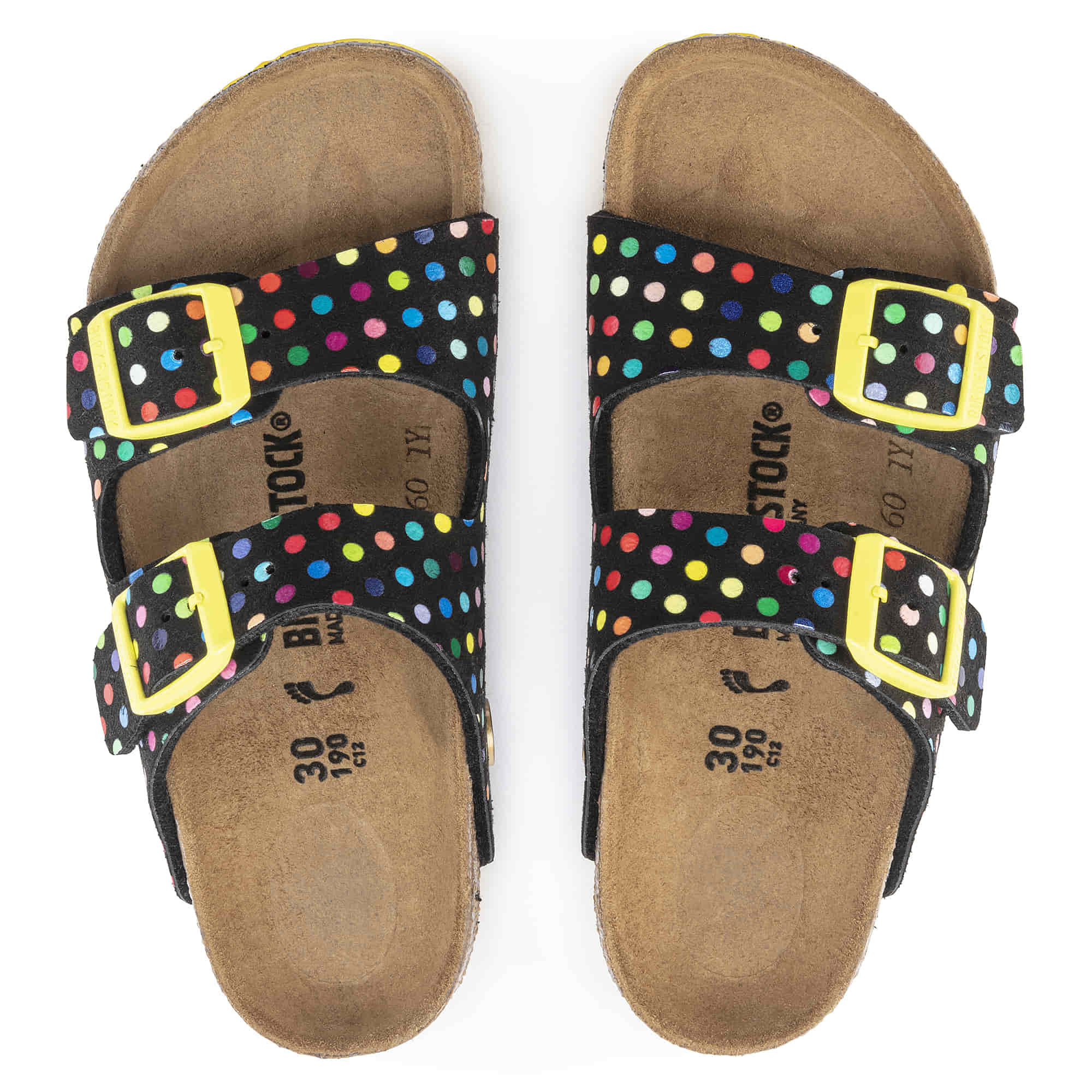 The BIRKENSTOCK Arizona is a genuine classic that has been delighting wearers with its timeless design for decades. The two-strap model fits kids' feet perfectly even during boisterous play! This version comes in a creatively vibrant play of colors and is just the thing for fans of the polka-dot print. The color-contrasting details round off the shoe's look of sophistication. The upper is made from skin-friendly microfiber.