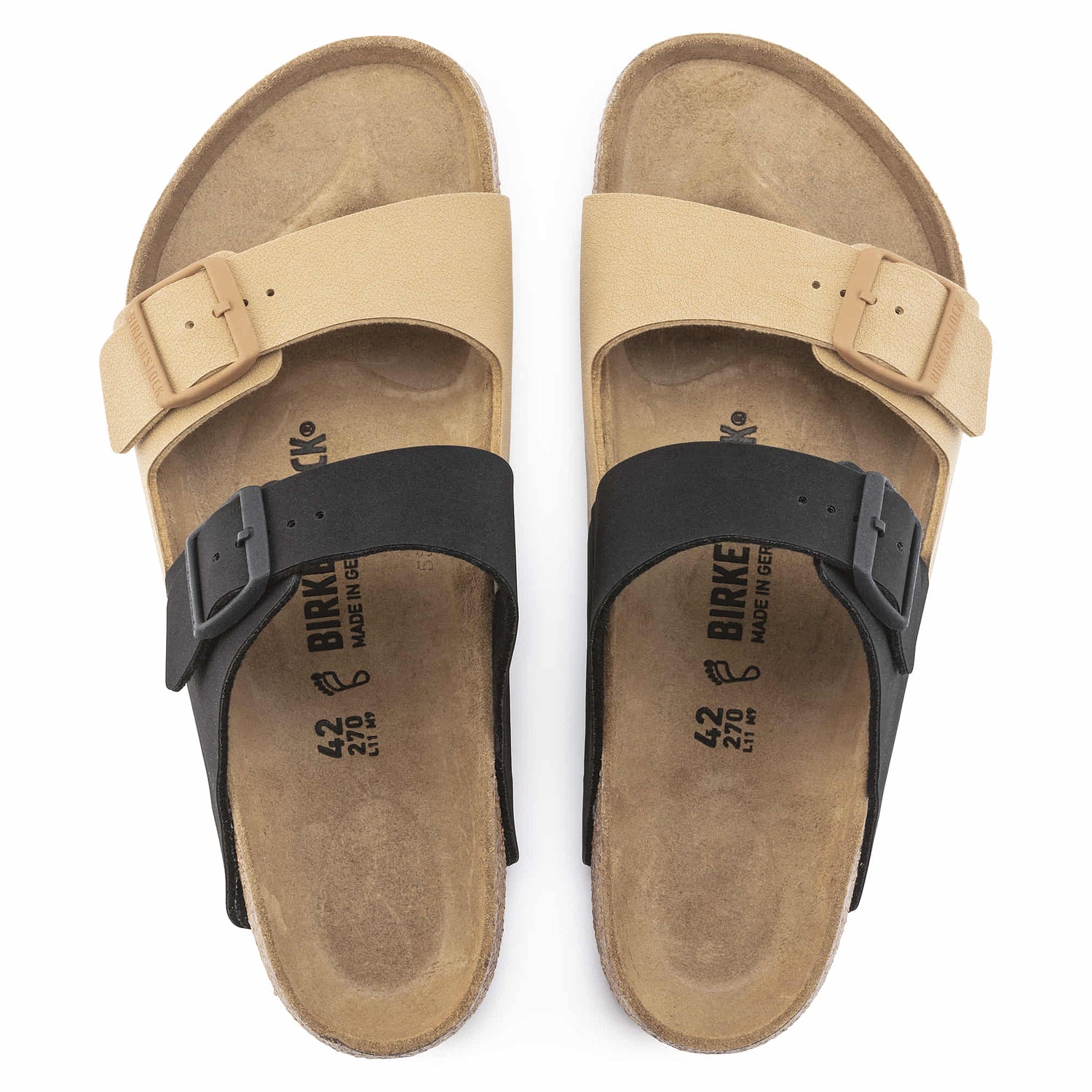 The BIRKENSTOCK Arizona is a genuine classic that has been delighting both men and women with its timeless design for decades. This version boasts color-bocking and plays with contrasts. This popular sandal has been given an update in a new material, with a vegan version now available. It is entirely free of animal products, as verified by independent testing laboratories. The upper is made from the skin-friendly, hard-wearing synthetic material Birko-Flor® in a sophisticated nubuck look which boasts a texture and color that could almost be mistaken for real leather. The color-coordinated buckles with a textile feel and a matte design are additional eye-catchers.