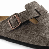 This version of the Boston clog, a classic BIRKENSTOCK model, comes with a shaft in soft, high-quality woolen felt. The clog can be adapted to all feet thanks to a strap on the upper edge of the shaft and a sturdy metal buckle.