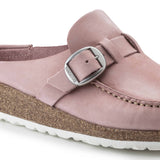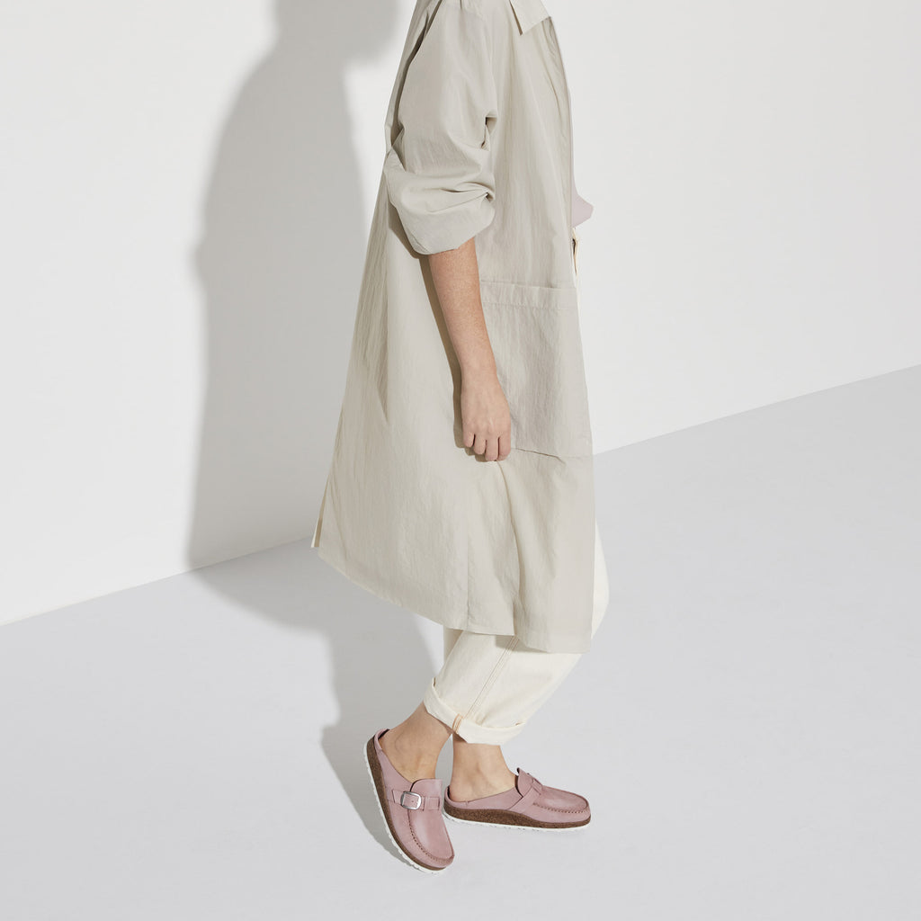 The BIRKENSTOCK Buckley is a semi-open moccasin-style clog that instantly recognizable as an authentic BIRKENSTOCK original thanks to its thick cork sole. The striking stitching catches the eye. The color-coordinated footbed rounds off the shoe look of sophistication. The upper is made from high-quality nubuck leather that boasts a natural, rustic appearance.
