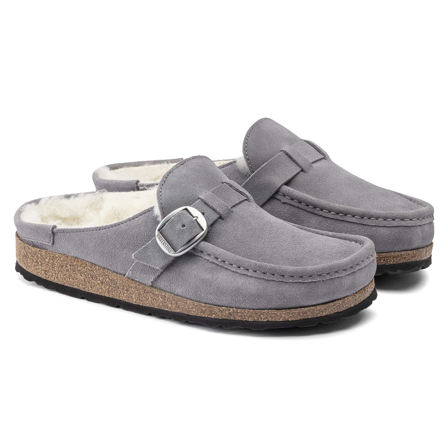 The BIRKENSTOCK Buckley is a semi-open moccasin-style clog that's instantly recognizable as an authentic BIRKENSTOCK original thanks to its thick cork sole. The striking stitching catches the eye. Here, the classic model comes in a particularly cozy version with shearling and our popular Big Buckle. The perfect shoe for cozy winter evenings by an open fire! Its natural design is down to the upper made from especially soft suede, which hugs the foot like a second skin.