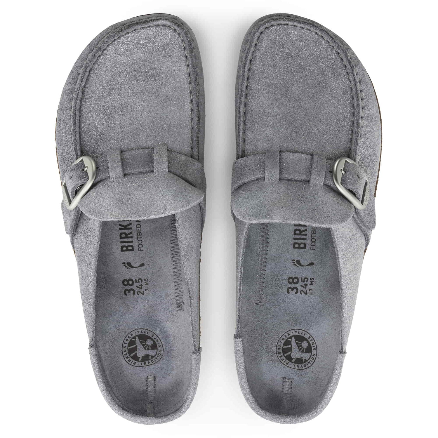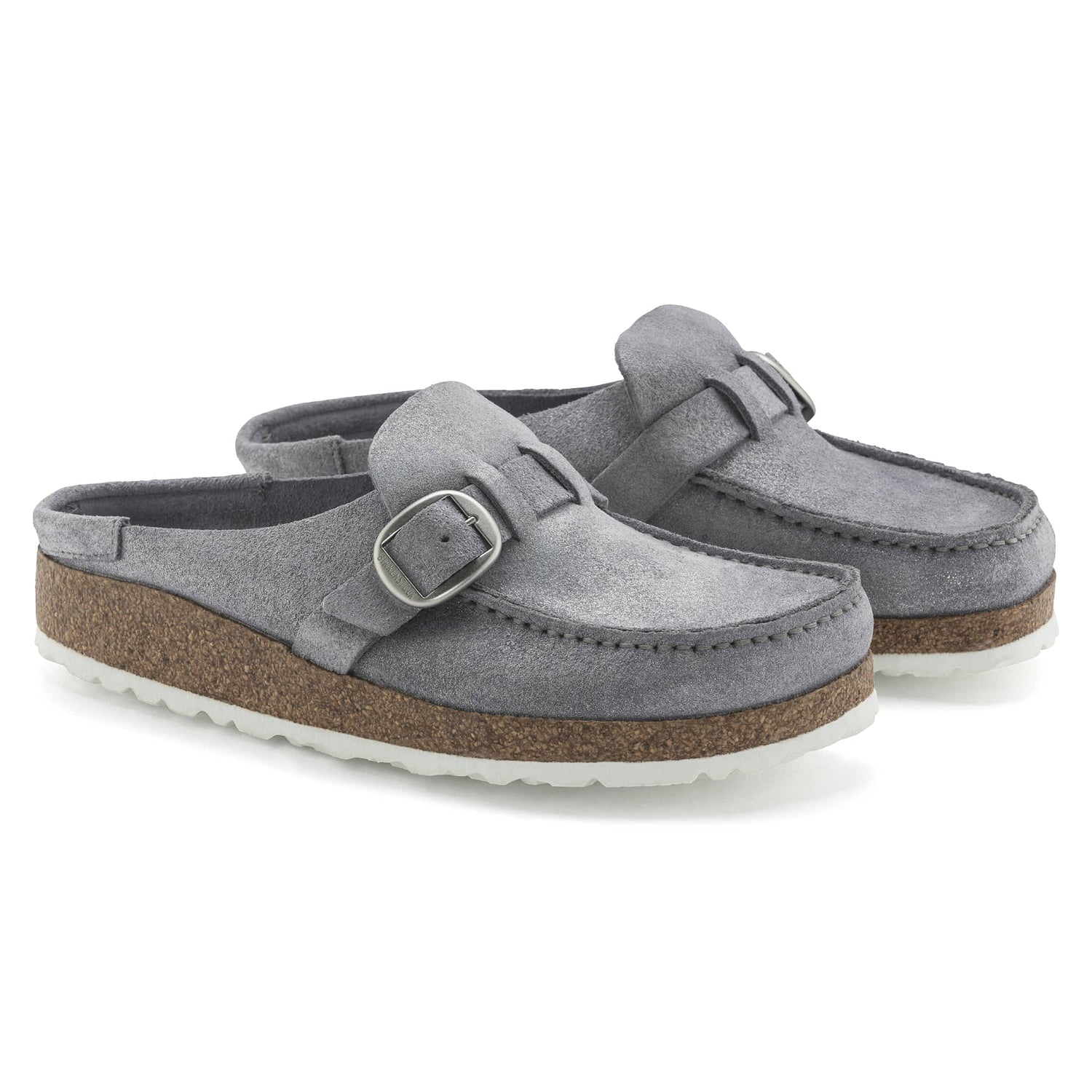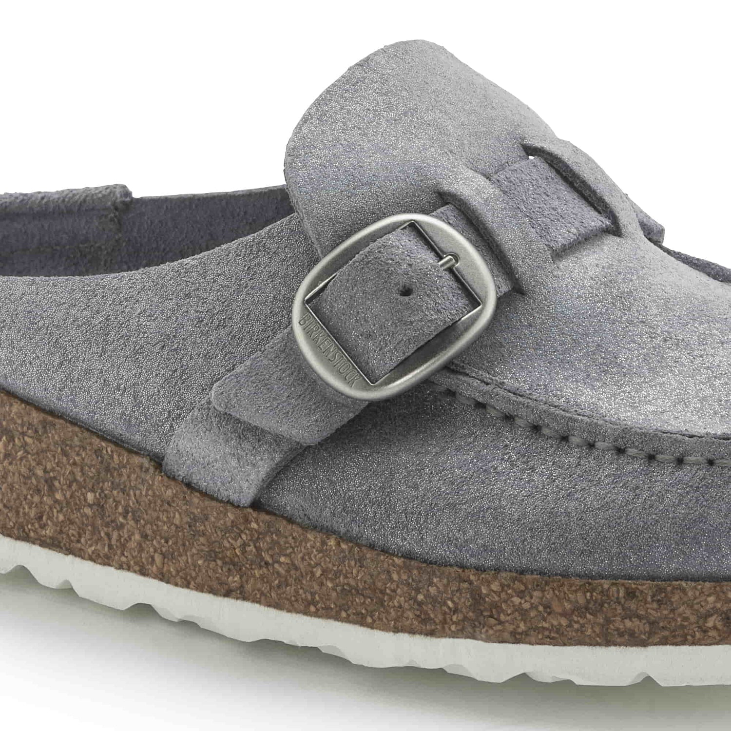 The BIRKENSTOCK Buckley is a semi-open moccasin-style clog that's instantly recognizable as an authentic BIRKENSTOCK original thanks to its thick cork sole. The striking stitching catches the eye. This version boasts a subtle glitter finish which makes the shoes shimmer in the light. The color-coordinated footbed rounds off the shoe's look of sophistication. Its natural design is down to the upper made from especially soft suede, which hugs the foot like a second skin.