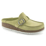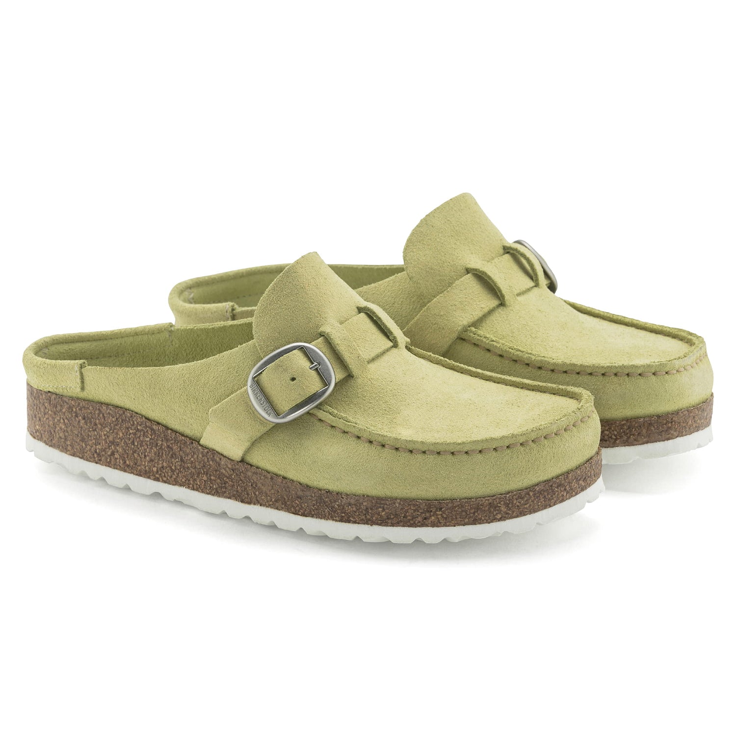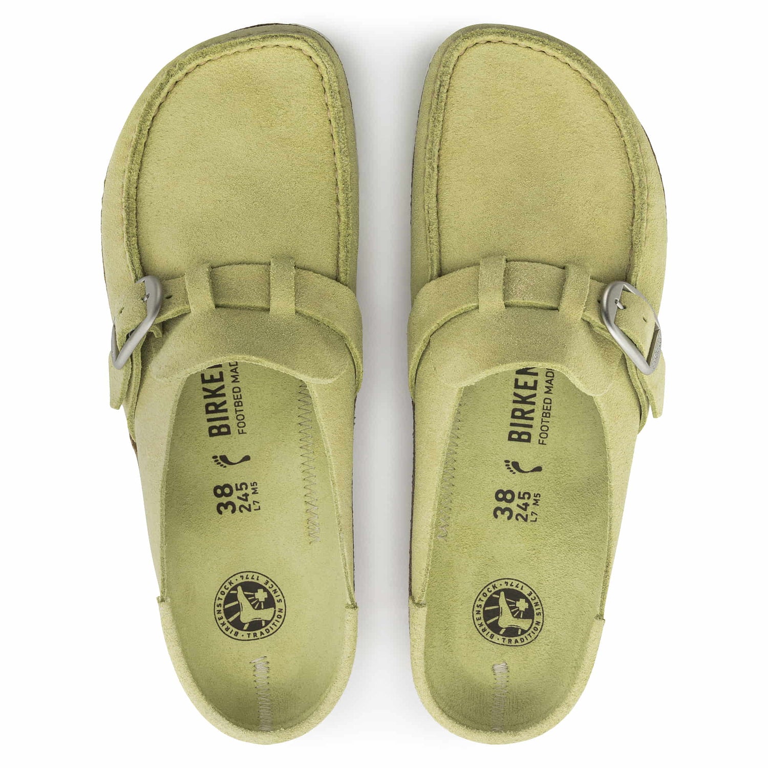 The BIRKENSTOCK Buckley is a semi-open moccasin-style clog that's instantly recognizable as an authentic BIRKENSTOCK original thanks to its thick cork sole. The striking stitching catches the eye. This version boasts a subtle glitter finish which makes the shoes shimmer in the light. The color-coordinated footbed rounds off the shoe's look of sophistication. Its natural design is down to the upper made from especially soft suede, which hugs the foot like a second skin.