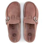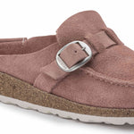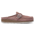 The BIRKENSTOCK Buckley is a semi-open moccasin-style clog that's instantly recognizable as an authentic BIRKENSTOCK original thanks to its thick cork sole. The striking stitching catches the eye. This version comes with our popular Big Buckle. Its natural design is down to the upper made from especially soft suede, which hugs the foot like a second skin.