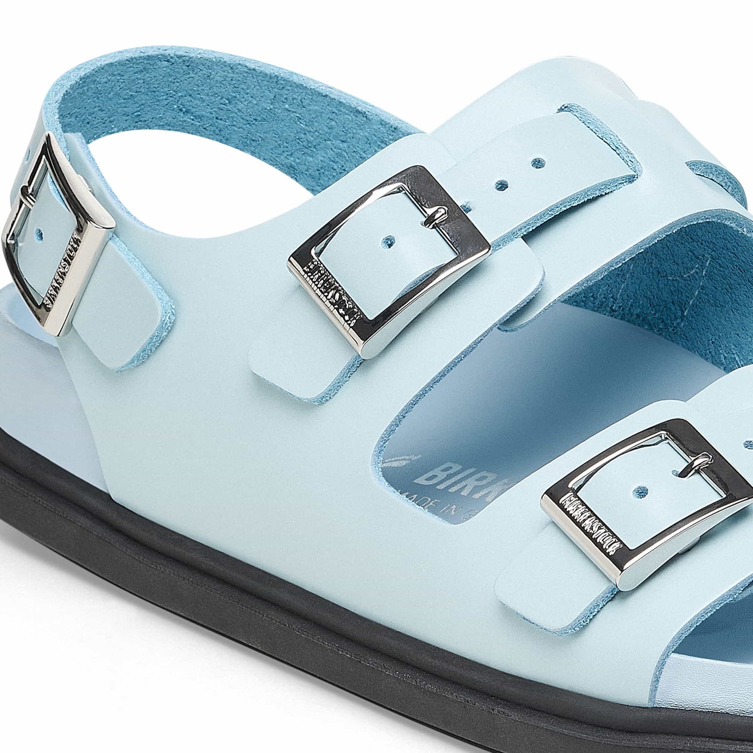 The BIRKENSTOCK Cannes is a puristic and modern style. It makes an impression with its delicate, premium look and its feminine elegance. The shiny, convex Zamak buckles are a sophisticated eye-catcher. The exquisite footbed is fully lined with soft piumato leather, making it exceptionally comfortable. The discontinuous outsole in the forefoot supports the foot's roll-off motion and offers maximum flexibility. The upper is made from high-quality, soft natural leather.