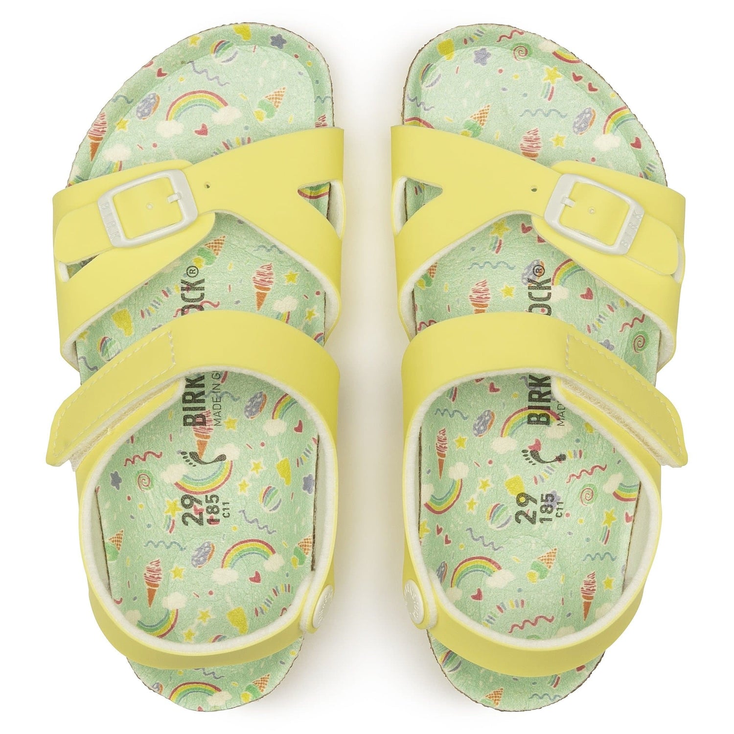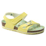 The BIRKENSTOCK Colorado is a variation on the classic Rio. The heel strap buckle has been replaced by a hook-and-loop fastener, allowing it to be put on and taken off in an instant perfect for kids impatient feet! This version of the sandal will set girls hearts racing. The ice cream-colored pastel shades and the colorful footbed will put a smile on kids faces all summer long. The colorful two-layer sandwich sole additionally catches the eye. The upper is made from the skin-friendly, hard-wearing synthetic material Birko-Flor®.