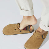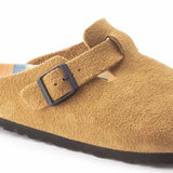 The BIRKENSTOCK Boston clog is a veritable classic that can easily be worn all year round. This model is characterized by a modern graphic pattern on the footbed. The color-coordinated buckles with a textile feel and a matte design are additional eye-catchers. The upper is made from especially soft suede which hugs the foot like a second skin.