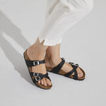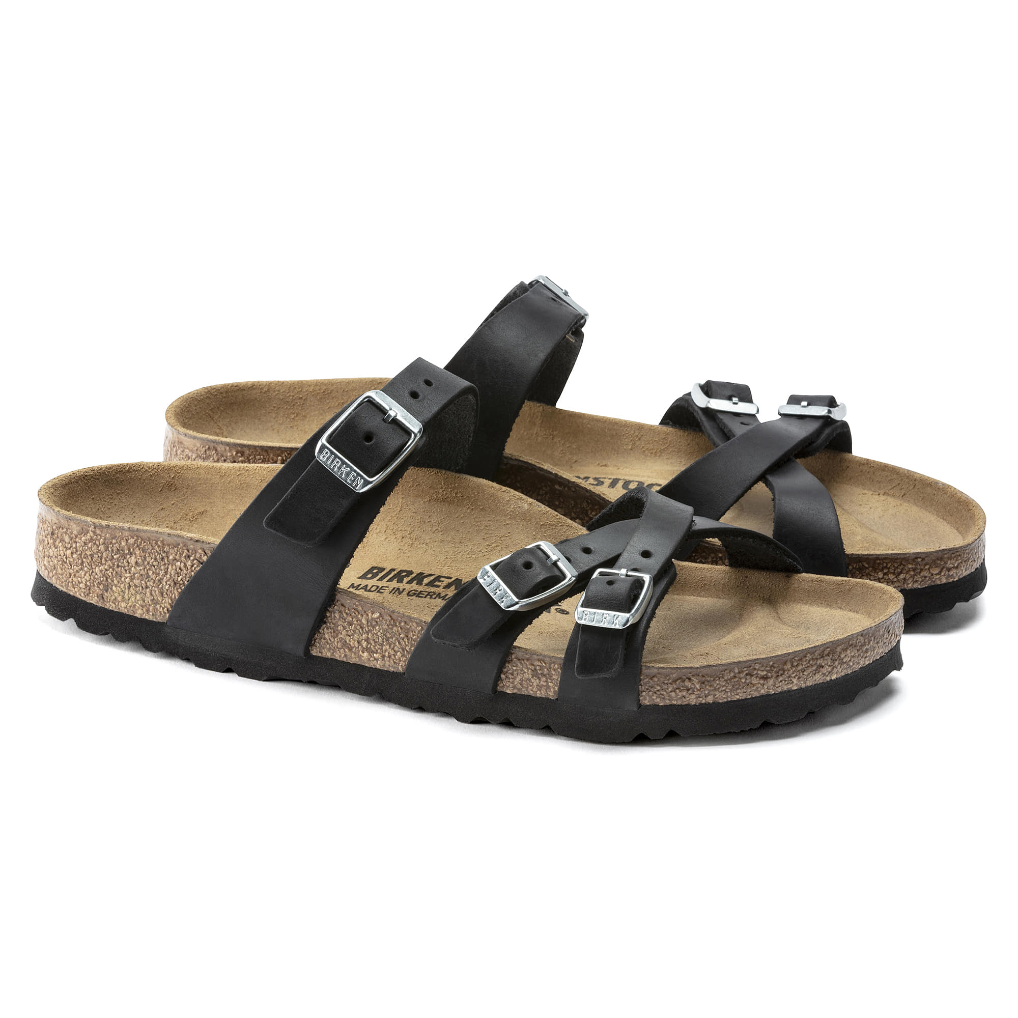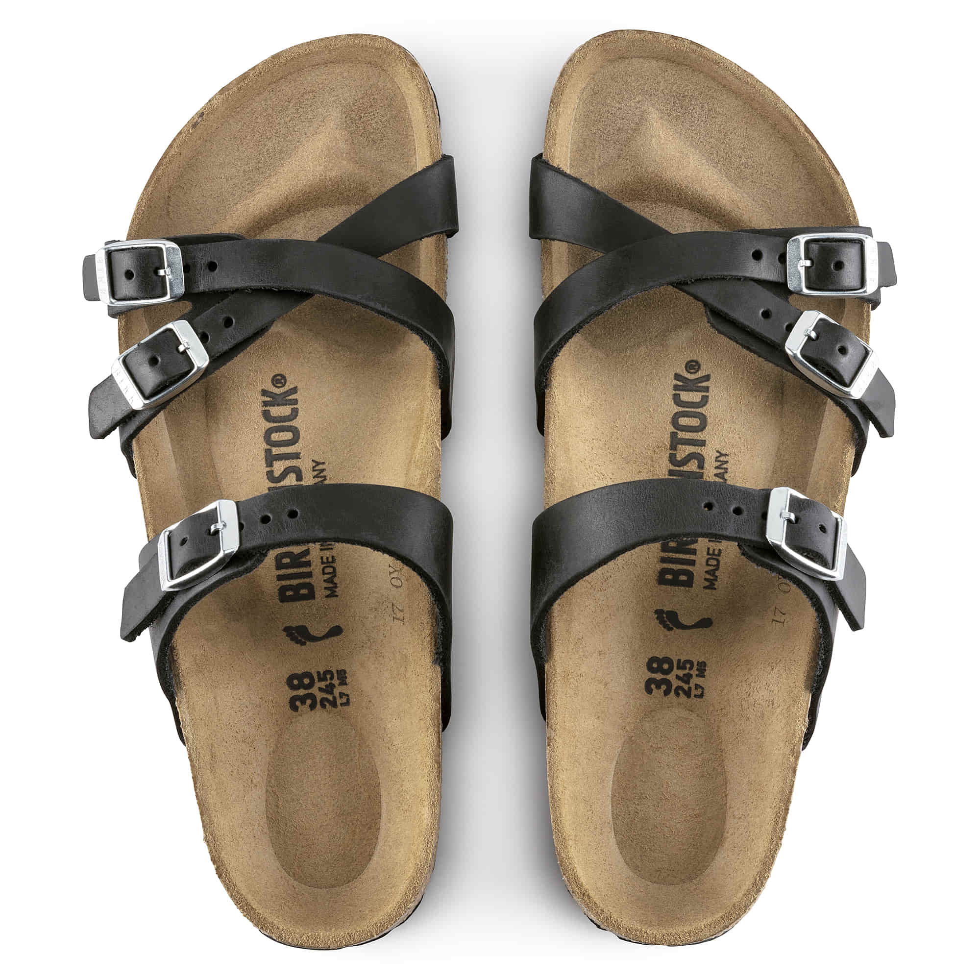 The BIRKENSTOCK Franca is a jaunty sandal with slim cross-over straps. The impressive combination of design and wearability will see fashion-conscious women through the day with elegance and comfort. The upper is made from extra thick, oiled nubuck leather and features an open-selvage finish.