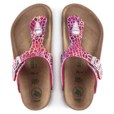 The BIRKENSTOCK Gizeh is a genuine classic that combines optimum grip with fashionable design to really turn heads at school. This version comes in a glittering disco design and will make girls hearts beat faster. A real eye-catcher at school! This popular sandal has been given an update in a new material, with a vegan version now available. It is entirely free of animal products, as verified by independent testing laboratories. The upper is made from skin-friendly microfiber.