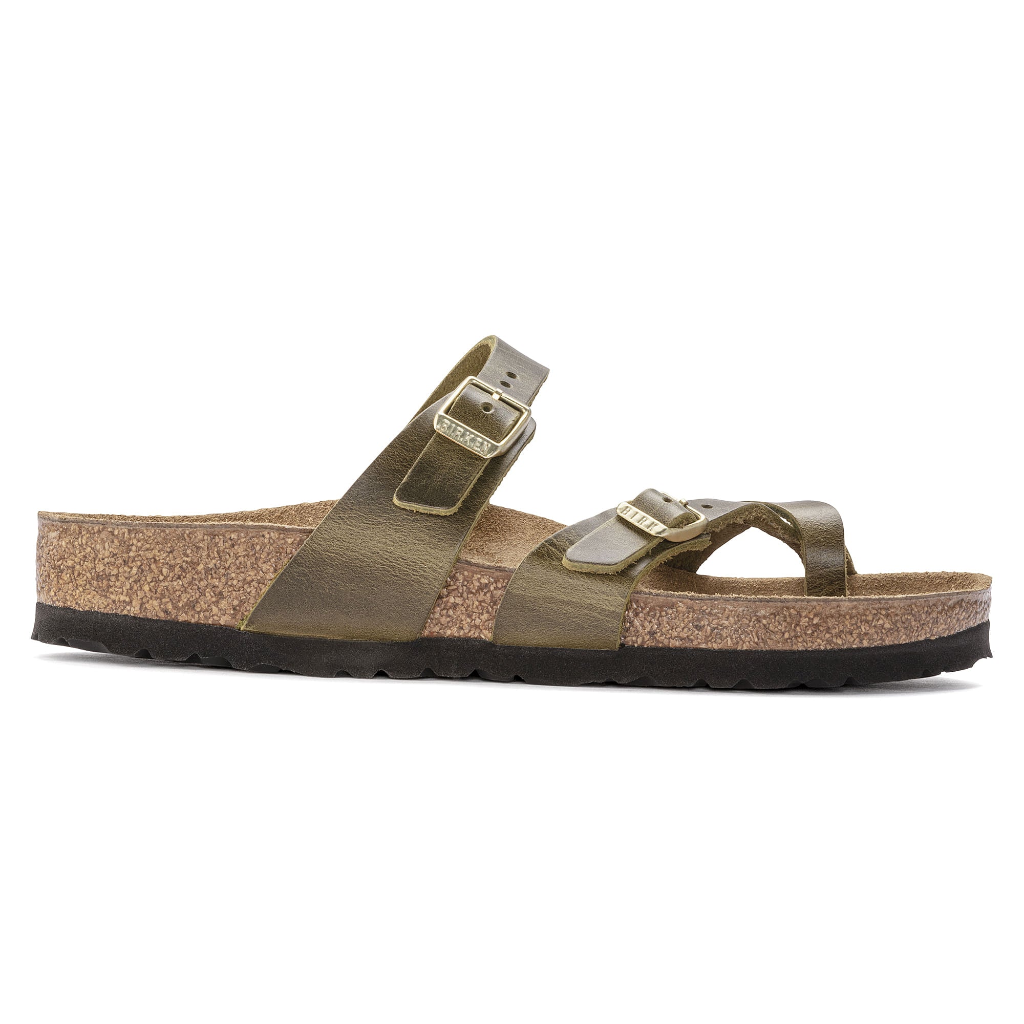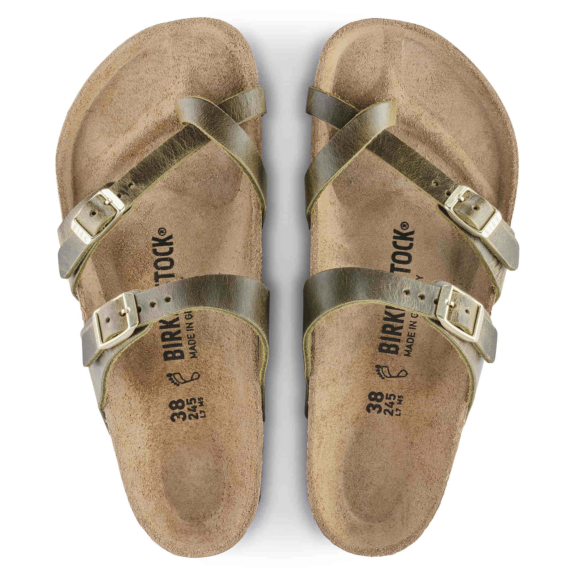 BIRKENSTOCK Mayari thong sandals have a bold design and toe loops. Design meets comfort for this design which accompanies fashion-conscious men and women throughout the day. The upper is made of especially thick, oiled nubuck leather with unfinished edges.