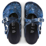 Perfect for active kids! The BIRKENSTOCK Dorian protects the toes, is airy and offers optimal hold even during rough-and-tough play. This design features elegant, snug velvet with a space design. For all those who love glitz and glamor: This sandal is bedazzled with brightness - like an endless sea of sparkling stars. The color-coordinated footbed rounds out the shoe sophisticated look.?