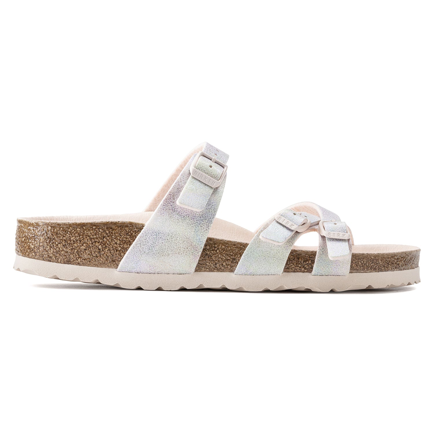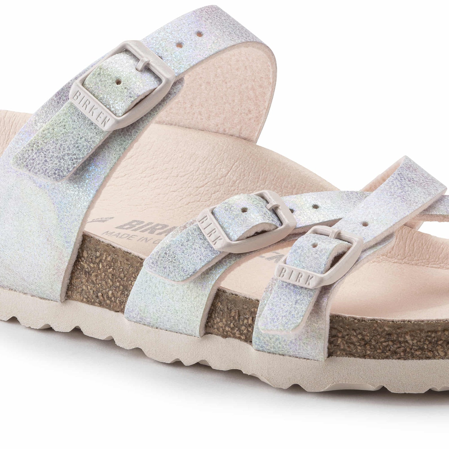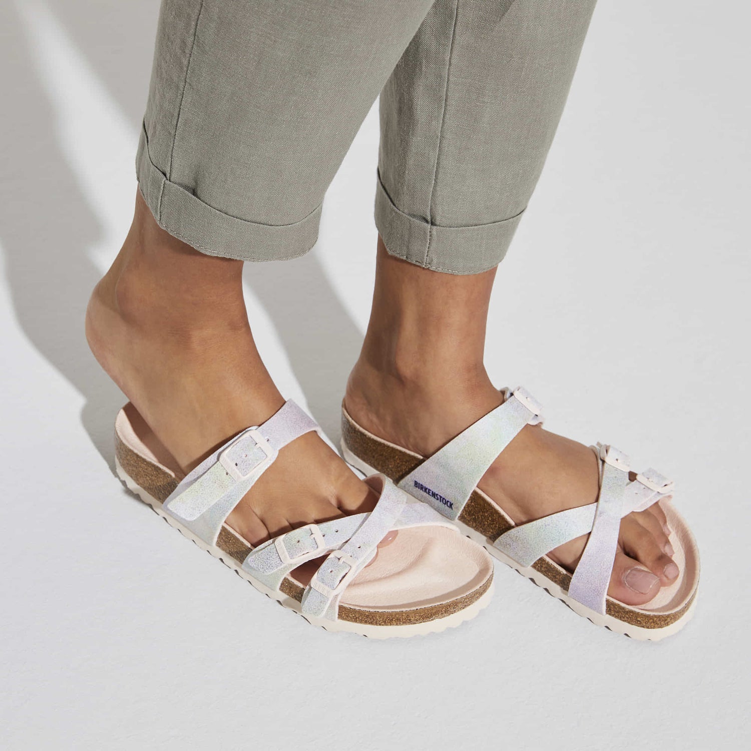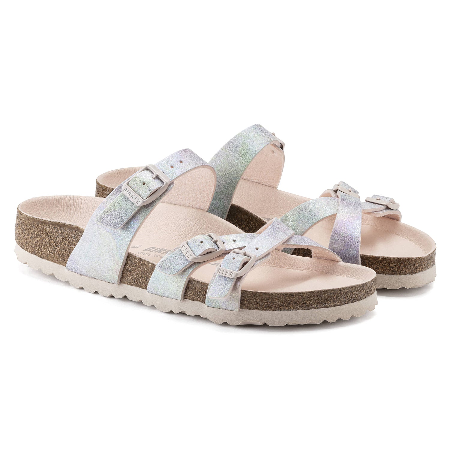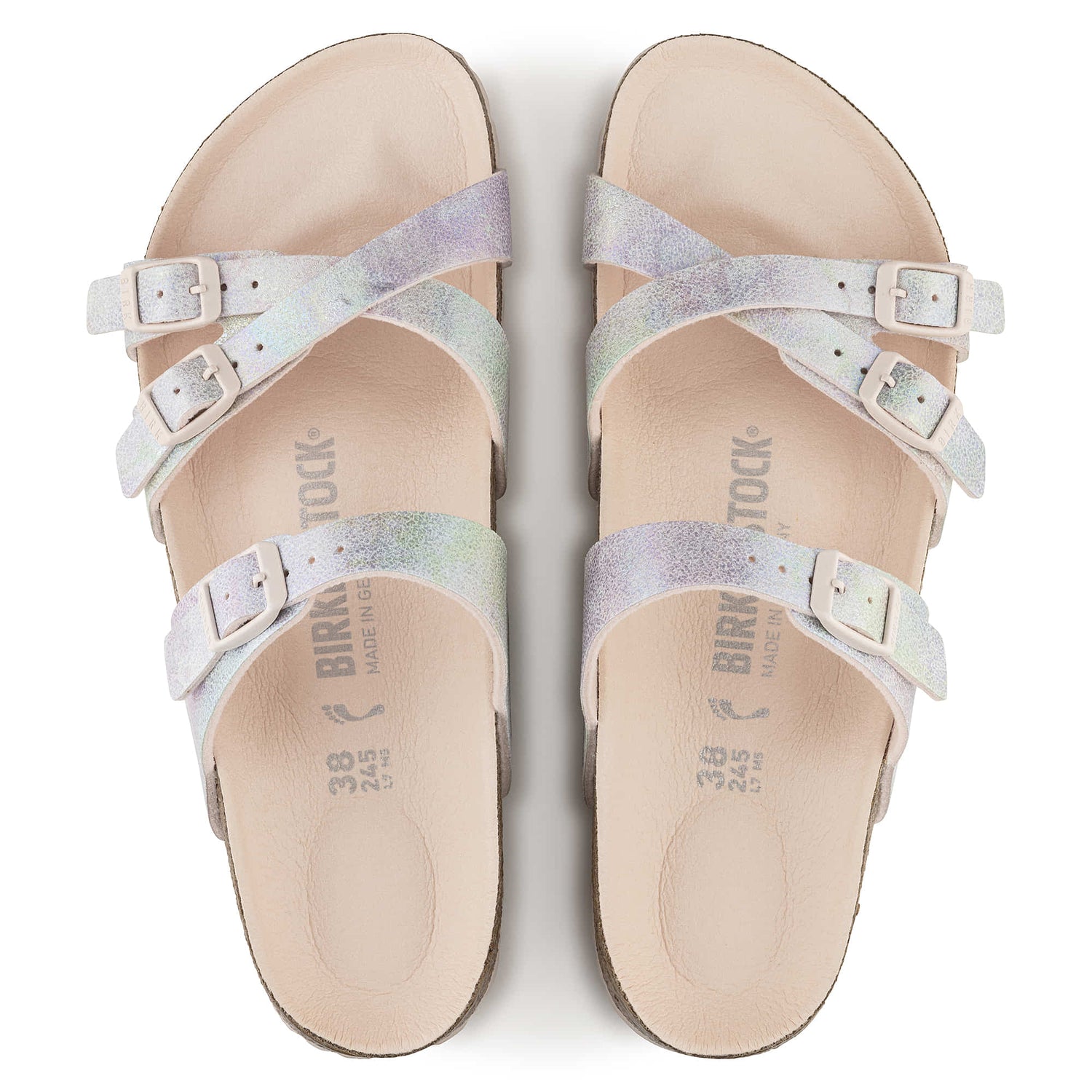The BIRKENSTOCK Franca is a jaunty sandal with slim cross-over straps. The impressive combination of design and wearability will see fashion-conscious women through the day with elegance and comfort. This popular sandal has been given an update in a new material, with a vegan version now available. It is entirely free of animal products, as verified by independent testing laboratories. This version features an iridescent, silky sheen and sparkles in all colors of the rainbow. The color-coordinated details round off the shoes look of sophistication. The upper is made from skin-friendly microfiber.