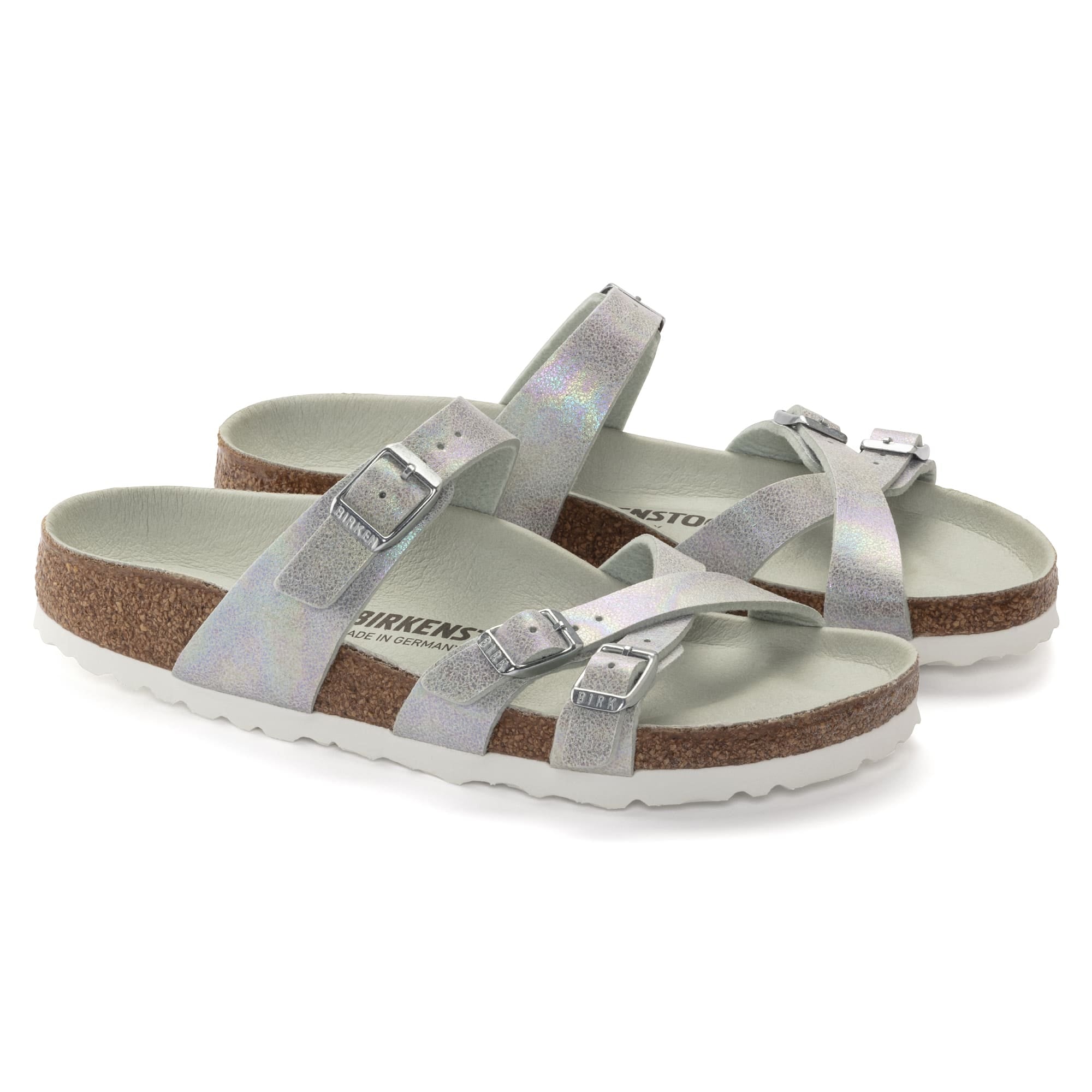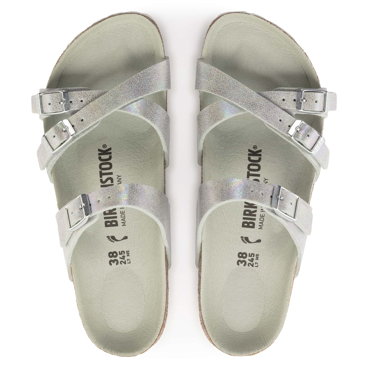 The BIRKENSTOCK Franca is a jaunty sandal with slim cross-over straps. The impressive combination of design and wearability will see fashion-conscious women through the day with elegance and comfort. This popular sandal has been given an update in a new material, with a vegan version now available. It is entirely free of animal products, as verified by independent testing laboratories. This version features an iridescent, silky sheen and sparkles in all colors of the rainbow. The color-coordinated details round off the shoes look of sophistication. The upper is made from skin-friendly microfiber.