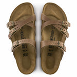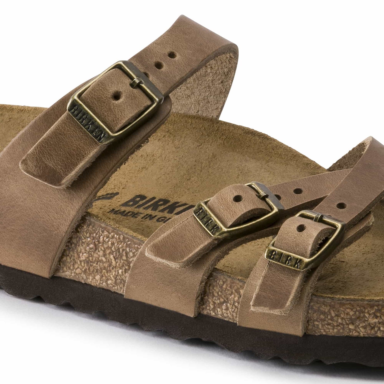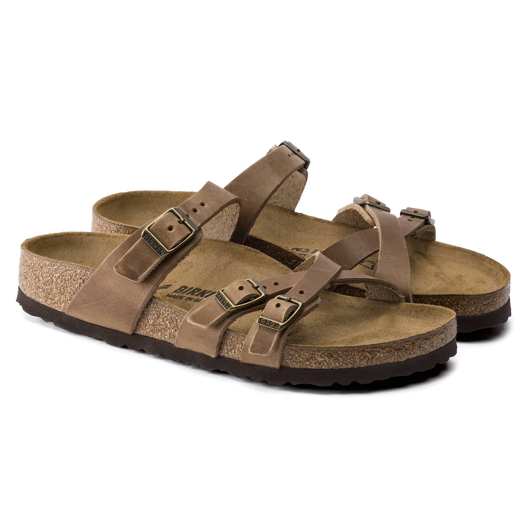 The BIRKENSTOCK Franca is a jaunty sandal with slim cross-over straps. The impressive combination of design and wearability will see fashion-conscious women through the day with elegance and comfort. The upper is made from extra thick, oiled nubuck leather and features an open-selvage finish.