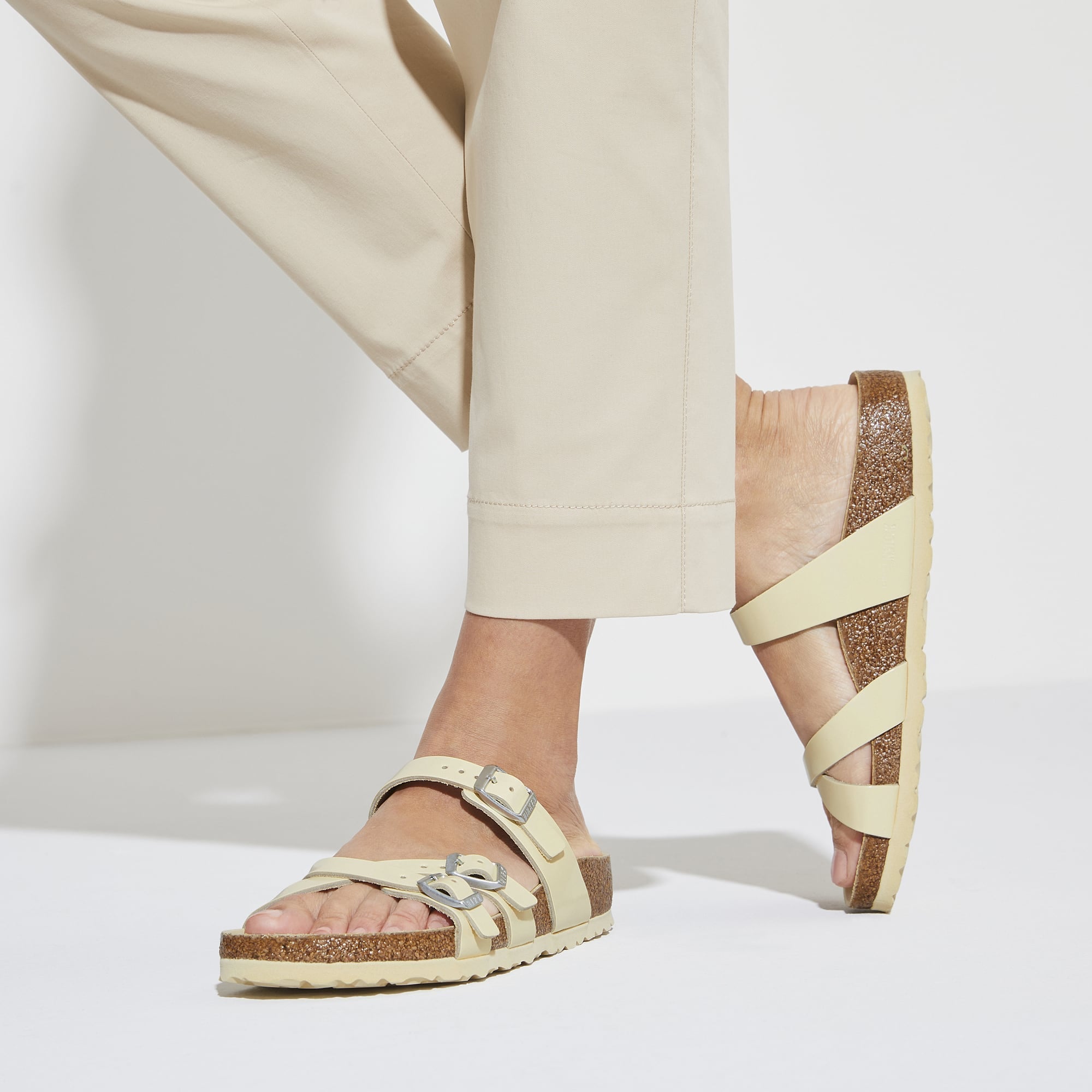 The BIRKENSTOCK Franca is a jaunty sandal with slim cross-over straps. The impressive combination of design and wearability will see fashion-conscious women through the day with elegance and comfort. The semi-exquisite footbed is fully lined with soft piumato leather, making it exceptionally comfortable. The upper is made from high-quality natural leather with a shiny patent coating.